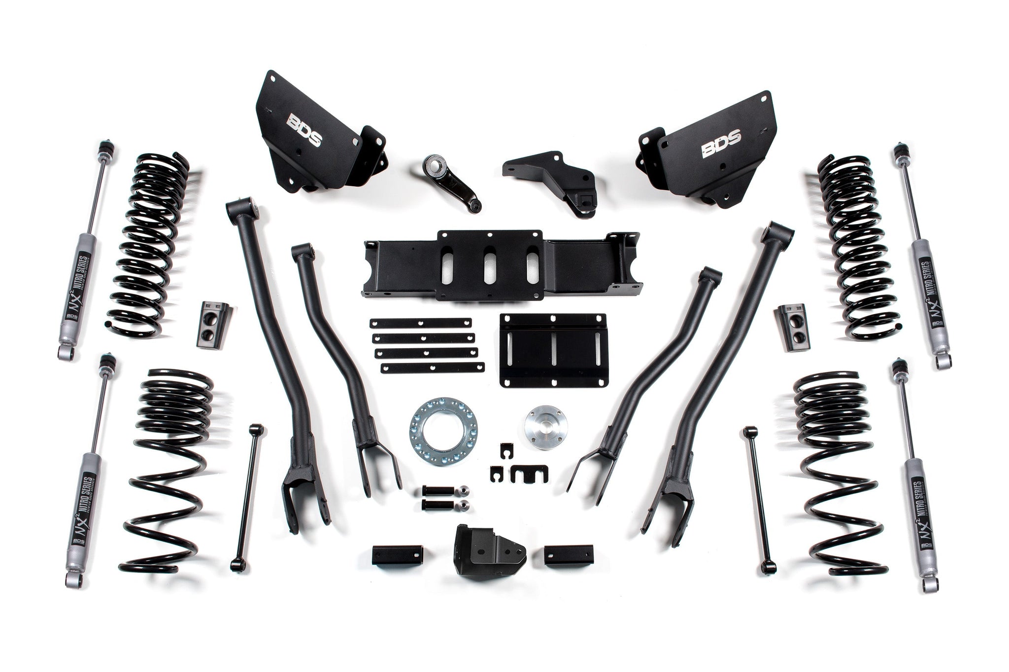 Convert the factory stamped steel radius arms over to the BDS 4-link to optimize suspension geometry for better handling characteristics while adding strength and stability. This bolt-on upgrade utilizes high-strength 1/4-inch steel brackets that allow mounting of HD upper and lower control arms to correct axle positioning while limiting caster change throughout wheel travel.