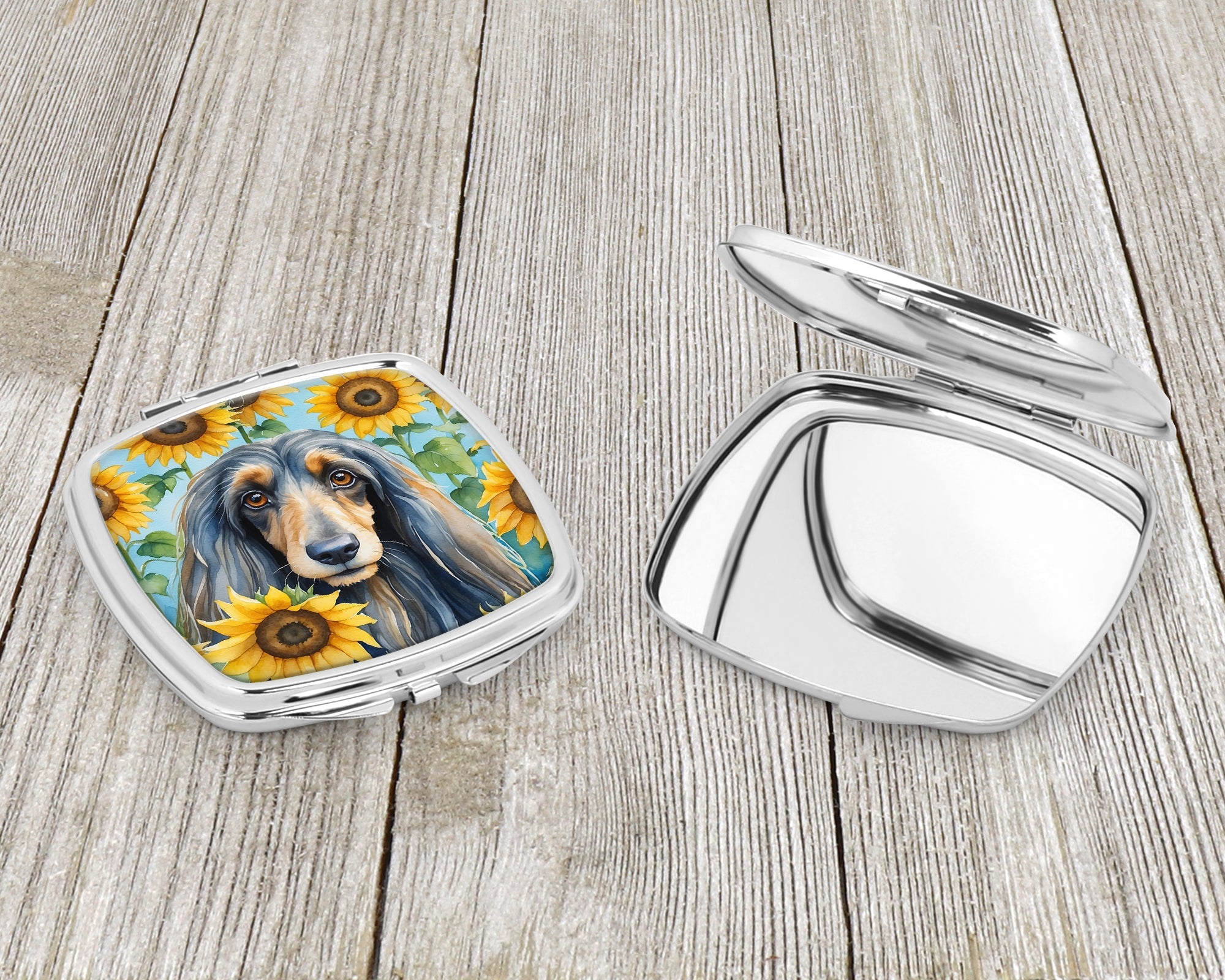 Decorate your space with our Afghan Hound artwork on a Compact Mirror. Bring a bit of Summer into your home with a Summer Compact Mirror. Introducing our Square Compact Mirror, a blend of elegance, functionality, and compactness, perfect for on-the-go touch-ups. This Silvertone metal mirror, with dimensions of 2.75 inches x 3 inches x .3 inches, fits effortlessly into your purse, handbag, or pocket, ensuring that you can check your appearance anytime, anywhere. Our compact mirror stands out with its eye-catching artwork on the front, adding a dash of style to this practical accessory. It is more than just a mirror; it's a statement piece that reflects your personality and aesthetic. When opened, this compact reveals two mirrors inside, doubling your perspective for precise touch-ups. The Silvertone metal construction ensures durability while maintaining a lightweight feel, making it an ideal everyday carry item. Whether you're rushing to a meeting, prepping for a dinner date, or just need a quick check on your look, our Square Compact Mirror is your reliable companion. Experience the perfect blend of style and practicality with this must-have accessory.