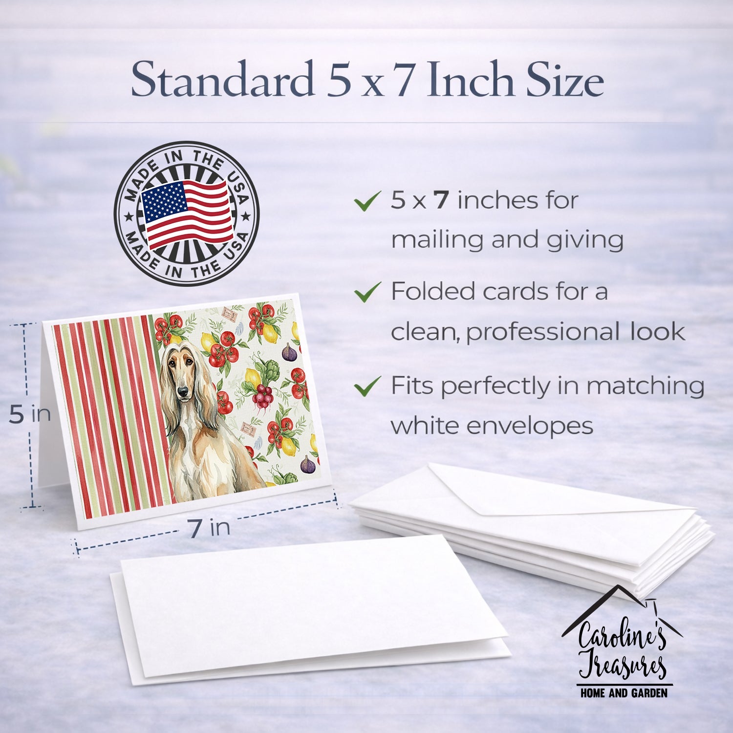 Shown here is the Afghan Hound Vegetables Greeting Cards Pack of 8 from Caroline's Treasures featuring artwork of a Afghan Hound in a Everyday design. The detailed illustration and vibrant colors make it a standout accent that celebrates both seasonal style and love for the subject. This image features a vibrant watercolor vegetable pattern with tomatoes, lemons, artichokes, figs, radishes, and leafy greens arranged in a repeating design, paired with classic red and green stripes. The bright, garden-fresh palette creates a cheerful, farmhouse-inspired look that feels lively, welcoming, and perfect for kitchen décor. Everyday décor celebrates personal style and the small moments that make a house feel like home. Thoughtful designs add warmth and personality that can be enjoyed year-round. Celebrate special moments with Caroline's Treasures Printed Greeting Card Pack. This pack includes eight beautifully folded 5x7 cards, accompanied by eight matching white envelopes. With blank interiors, these cards provide ample space for your personalized messages and heartfelt holiday greetings. Each card features captivating full-color artwork, meticulously printed in our facility on high-quality 80 lb cover stock or 216 GSM. The super smooth finish of the white cards enhances the visual impact of the artwork, creating a truly stunning presentation. Designed by our talented in-house artists or licensed artists, the artwork on these cards showcases their creativity and attention to detail. From vibrant illustrations to captivating designs, each card tells its own unique story. Whether it's for birthdays, anniversaries, holidays, or any special occasion, Caroline's Treasures Greeting Card Pack is the perfect way to convey your heartfelt sentiments. Share joy, love, and warm wishes with these exquisite cards and make every moment unforgettable. Perfect for: Writing personal messages, everyday correspondence, and thoughtful notes, Dogs-themed stationery collections, or year-round use for Afghan Hound lovers. Afghan Hounds are elegant sighthounds recognized for their long flowing coats, graceful movement, and dignified presence. Known for their independent nature and striking beauty, this ancient breed is admired by dog lovers who appreciate refinement and individuality. Makes a heartfelt gift for: Afghan Hound owners, Dogs lovers, Everyday gifts, pet parents, friends who adore their Afghan Hound, or anyone celebrating Dogs.