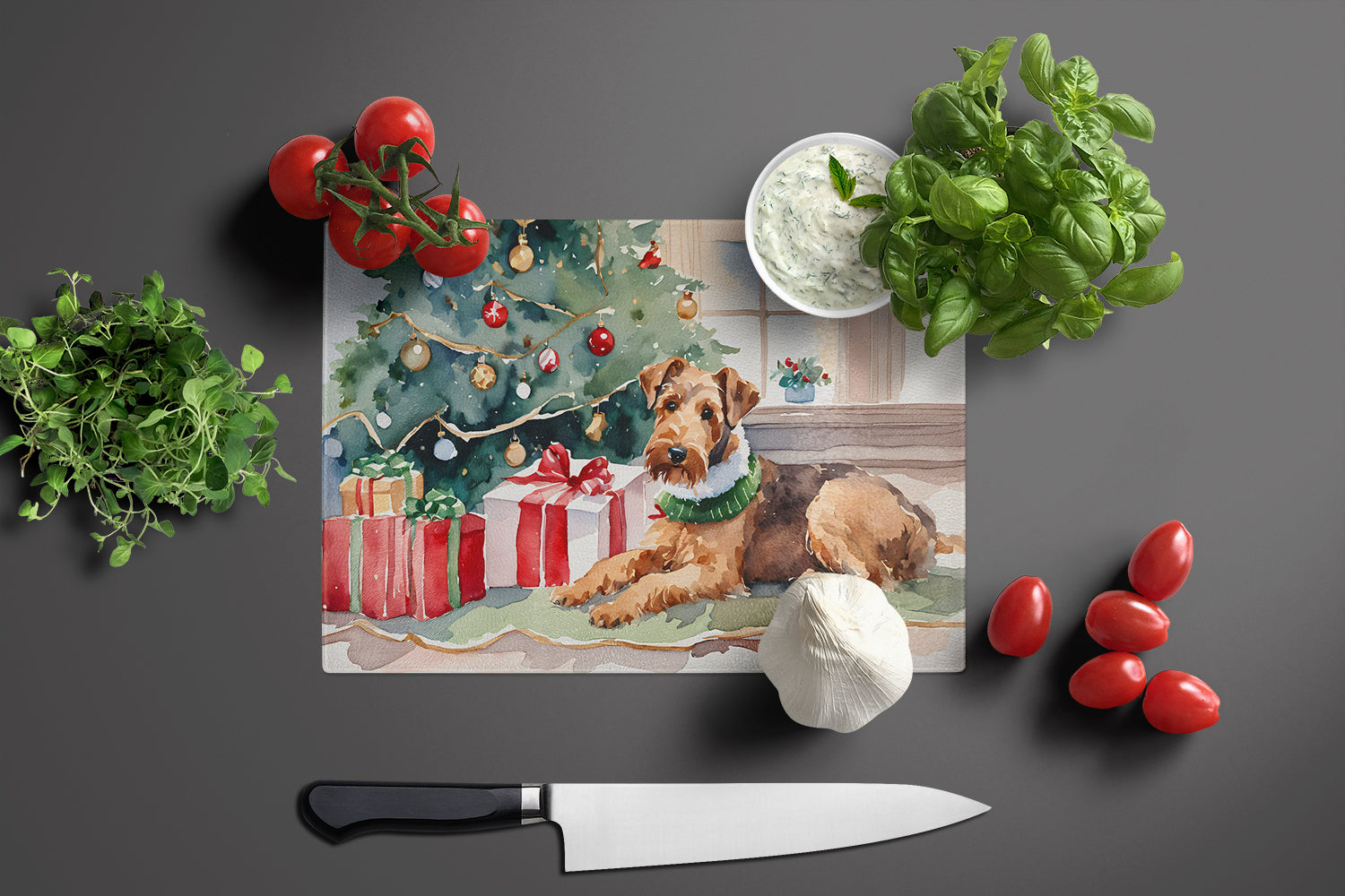 Decorate your space with our Christmas Airedale Terrier artwork on a Cutting Board. Introduce your kitchen to the vibrant, large Decorative Glass Cutting Board from Caroline's Treasures. Crafted from resilient tempered glass, this board is not only a utilitarian necessity but also a colorful art piece. With its generous dimensions of 15 inches in height and 12 inches in length, it offers ample space for all your cutting needs. Every piece showcases captivating artwork from distinguished artists, bringing an aesthetic edge to your kitchen. Beyond its attractive design, this cutting board ensures your countertop stays pristine and unscathed, owing to its heat-resistant properties. Engineered with user convenience in mind, it features non-skid feet for stability, and rounded corners for additional safety. Its robust construction renders it virtually unbreakable, guaranteeing longevity. The board comes with protective feet bumpers, maintaining its position during use. This product is recommended to be hand washed only. Proudly printed and assembled in the United States, this cutting board exemplifies superior craftsmanship. With Caroline's Treasures' Decorative Glass Cutting Board, you're investing in a blend of functionality and artistic flair.