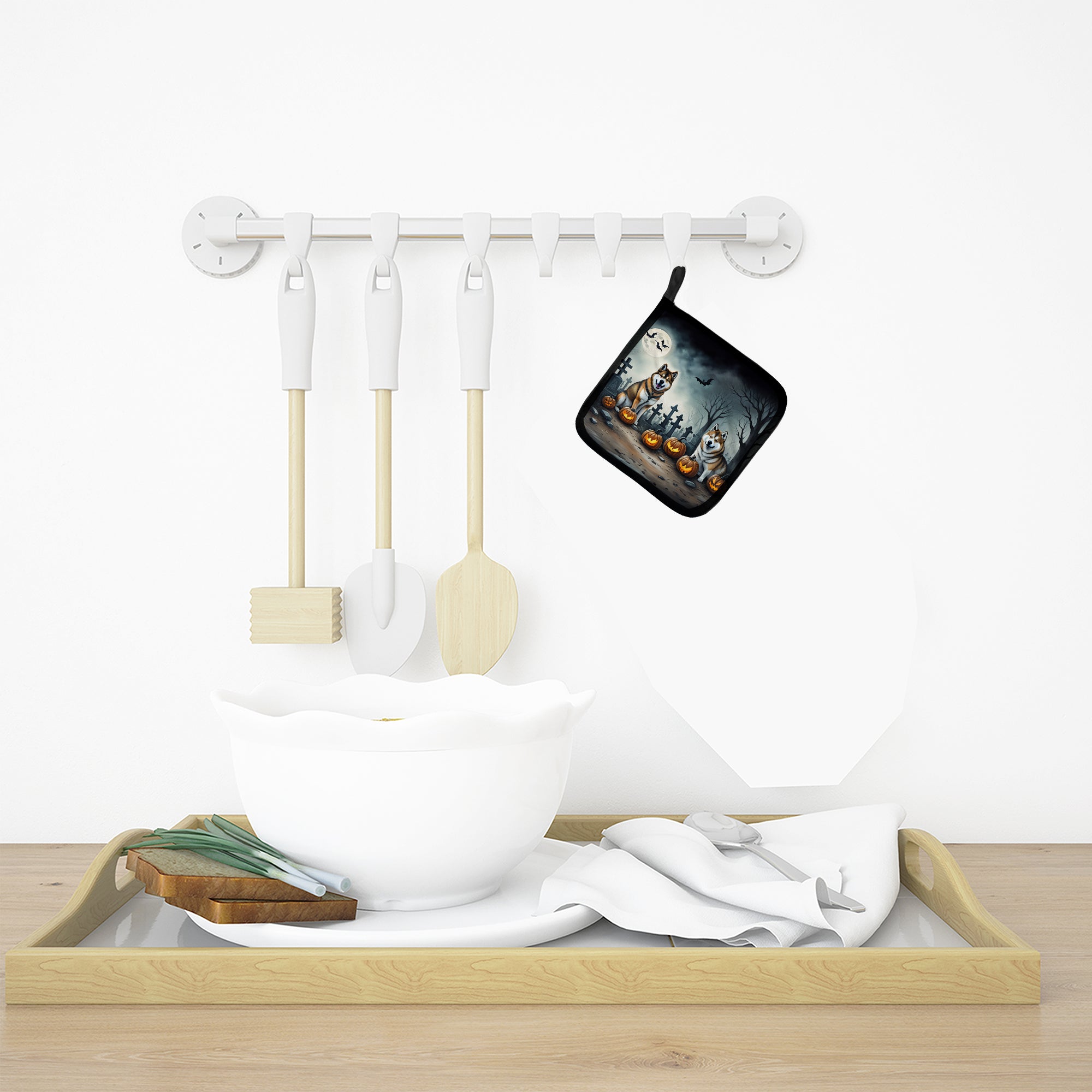 Decorate your space with our Halloween Akita artwork on a Pair of Pot Holders. A Pair of Pot Holders to match your kitchen decor. Made in the USA these are thick and functional. Full color artwork decorates the front polyester fabric of the hot pad and accented by a black trim. Use these at as a trivet for your Thanksgiving or Christmas tablescape. Filled with insulated fabric and quilted for durability. These colorful pot holders will make a great gift for your favorite home cook or executive chef. Each pot holder measures approximately 7 1/2 inches by 7 1/2 inches. A hanging tab is included.