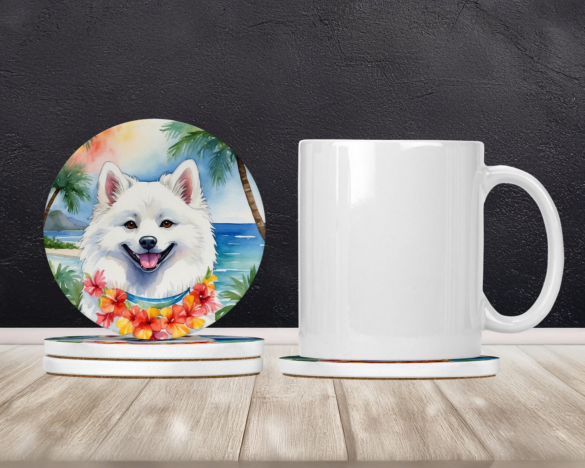 Large Sandstone Coasters Pack of 4 featuring breed specific American Eskimo artwork. Introducing Caroline's Treasures Large Sandstone Coasters Pack of 4, the perfect addition to your home decor. Each coaster measures nearly 4 inches and is made from absorbent sandstone with a cork backing. Designed and printed in the United States, these coasters feature artwork from Caroline's Treasures' talented artists. Protect your countertops and tables from hot and cold drink condensation with these absorbent coasters. They efficiently absorb moisture, ensuring your surfaces stay dry and clean. Choose from a wide range of designs to update and enhance your decor or give them as a thoughtful gift for any occasion. Cleaning is a breeze—simply wipe the coaster with a damp towel to remove any spills or stains. Each set comes in a brown gift box, making it ready to be wrapped for that special person in your life. These absorbent sandstone coasters also make an excellent housewarming gift, providing both practicality and style. Celebrate birthdays, Mother's Day, Father's Day, Thanksgiving, Christmas, Teacher's Appreciation Day, or simply show someone you care with these versatile and charming coasters. Caroline's Treasures Large Sandstone Coasters Pack of 4 is the perfect happy gift for any occasion.