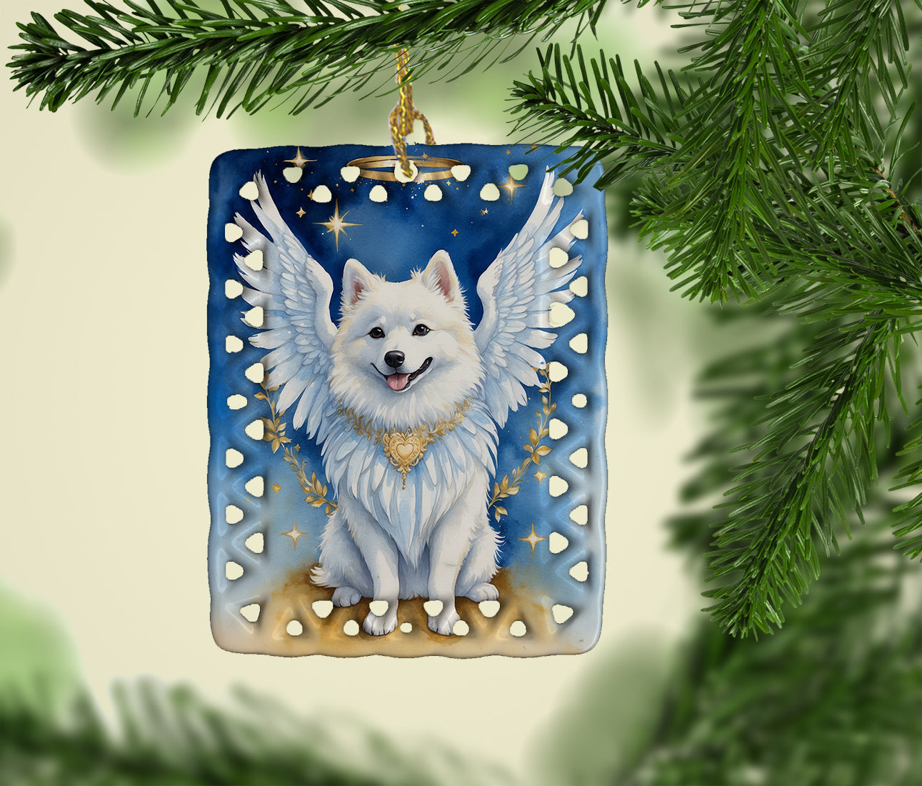 Porcelain Ornament featuring breed specific American Eskimo artwork. Celebrate Christmas with this Christmas Ornament. Add a unique, personal touch to your holiday decor with our Rectangular Lattice Porcelain Ornament. Perfect for creating cherished memories, this high-quality ornament shines under festive lights, reflecting warmth and joy throughout your Christmas tree. Crafted with a glossy finish, it showcases vibrant, full-color artwork contributed by our talented artists, ensuring your tree is adorned with a burst of color and holiday spirit. What sets this Porcelain Ornament apart is its customizable white back. Use a paint pen or permanent marker to write a heartfelt message, commemorate a special year, or mark an unforgettable date, turning this ornament into a keepsake that will be treasured for years to come. For best results, allow any personalization to dry thoroughly before handling. Each ornament comes complete with a delicate gold cord, making it easy to hang and display. Proudly made in the USA, this ornament measures 3.375 x 2.625 inches and is a thoughtful gift for pet sitters, teachers, family members, or anyone who would appreciate a little extra holiday magic. Bring style, charm, and a touch of personal meaning to your Christmas tree with this beautifully designed ornament..