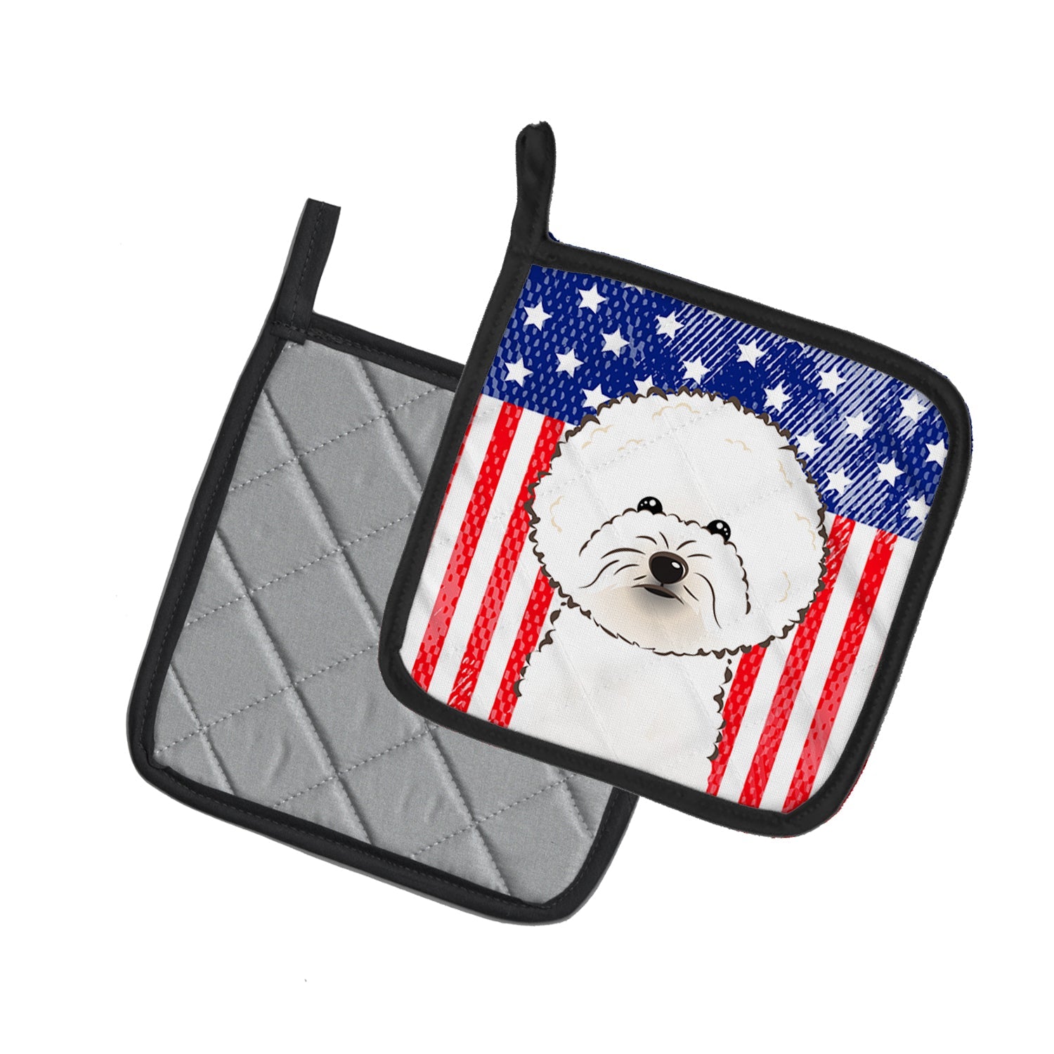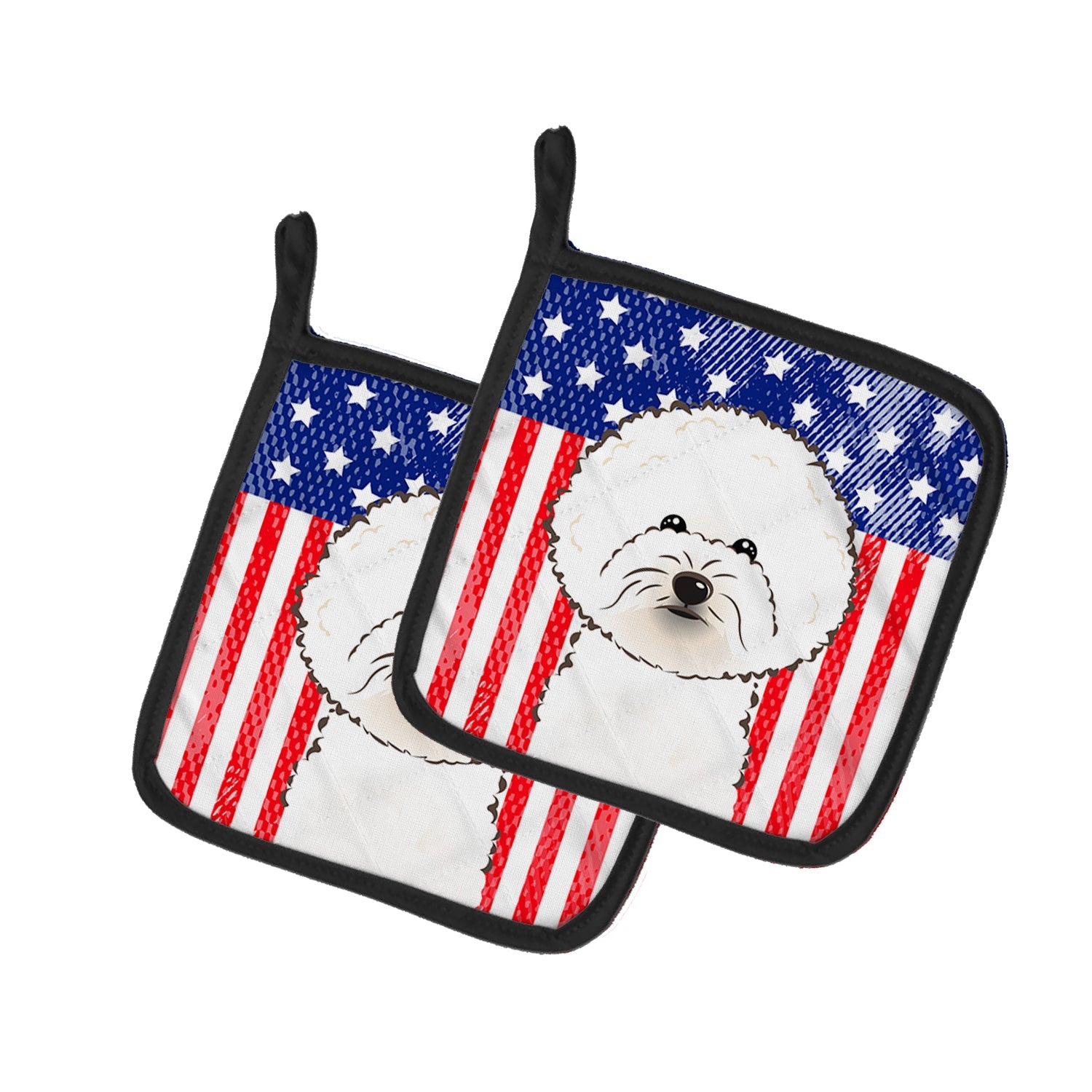 Decorate your space with our Bichon Frise artwork on a Pair of Pot Holders. A Pair of Pot Holders to match your kitchen decor. Made in the USA these are thick and functional. Full color artwork decorates the front polyester fabric of the hot pad and accented by a black trim. Use these at as a trivet for your Thanksgiving or Christmas tablescape. Filled with insulated fabric and quilted for durability. These colorful pot holders will make a great gift for your favorite home cook or executive chef. Each pot holder measures approximately 7 1/2 inches by 7 1/2 inches. A hanging tab is included.