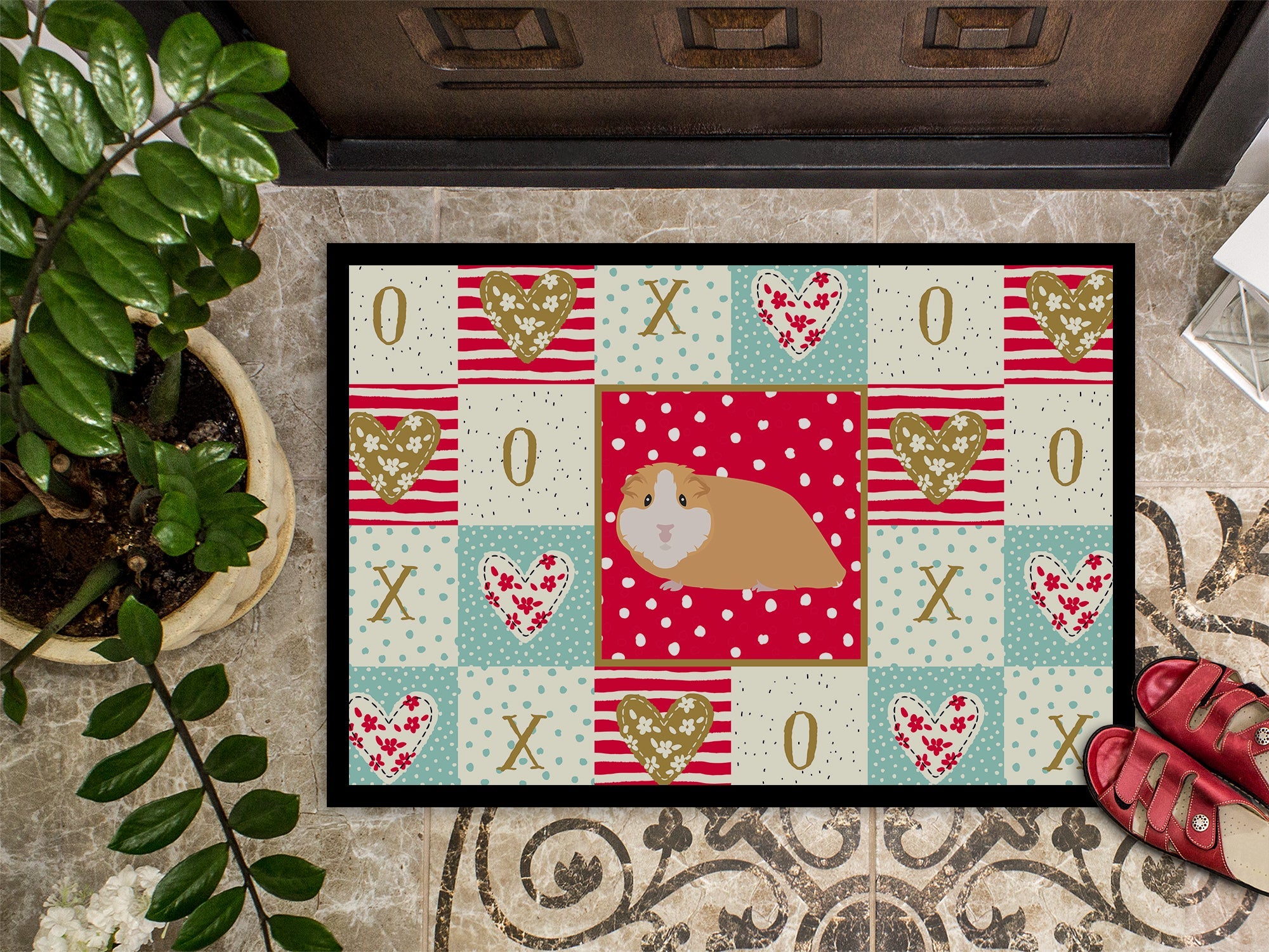 Decorate your space with our Valentine's Day American Guinea Pig artwork on a Doormat. Welcome your guests in style with our Artwork Door Mat, designed to withstand almost any weather condition. This mat, measuring approximately 18 by 27 inches, is held together by durable black binding tape. Its top layer, composed of polyester felt, is dyed with the eye-catching image you see on the mat. A few layers below provide the mat with stability, while its rubber bottom is stamped to help prevent slipping and ensures safety. Our mat works wonderfully as both an indoor or outdoor door mat. For cleaning, simply hose it off with water or use a power washer - no need for any cleaner that produces suds. Avoid scrubbing with a brush, instead, opt for the vacuum on floor setting. Designed manufactured and printed in the USA, this mat is a perfect addition to your porch, outdoor kitchen, entryway, or any indoor space. Its unique design makes it a charming decorative rug that greets your guests and adds a stylish touch to your home decor.