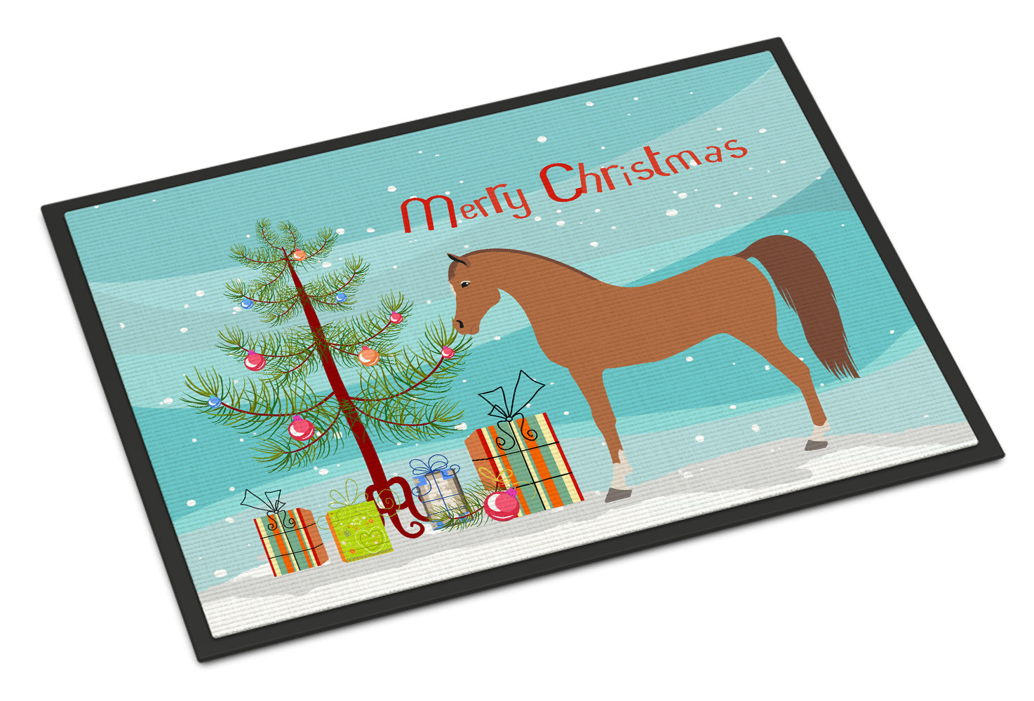 Decorate your space with our Christmas Arabian Horse artwork on a Doormat. Welcome your guests in style with our Artwork Door Mat, designed to withstand almost any weather condition. This mat, measuring approximately 18 by 27 inches, is held together by durable black binding tape. Its top layer, composed of polyester felt, is dyed with the eye-catching image you see on the mat. A few layers below provide the mat with stability, while its rubber bottom is stamped to help prevent slipping and ensures safety. Our mat works wonderfully as both an indoor or outdoor door mat. For cleaning, simply hose it off with water or use a power washer - no need for any cleaner that produces suds. Avoid scrubbing with a brush, instead, opt for the vacuum on floor setting. Designed manufactured and printed in the USA, this mat is a perfect addition to your porch, outdoor kitchen, entryway, or any indoor space. Its unique design makes it a charming decorative rug that greets your guests and adds a stylish touch to your home decor.