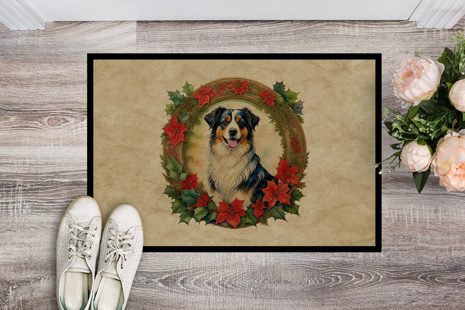 Decorate your space with our Christmas Australian Shepherd artwork on a Doormat. Bring a bit of Winter into your home with a Winter Doormat. Welcome your guests in style with our Artwork Door Mat, designed to withstand almost any weather condition. This mat, measuring approximately 18 by 27 inches, is held together by durable black binding tape. Its top layer, composed of polyester felt, is dyed with the eye-catching image you see on the mat. A few layers below provide the mat with stability, while its rubber bottom is stamped to help prevent slipping and ensures safety. Our mat works wonderfully as both an indoor or outdoor door mat. For cleaning, simply hose it off with water or use a power washer - no need for any cleaner that produces suds. Avoid scrubbing with a brush, instead, opt for the vacuum on floor setting. Designed manufactured and printed in the USA, this mat is a perfect addition to your porch, outdoor kitchen, entryway, or any indoor space. Its unique design makes it a charming decorative rug that greets your guests and adds a stylish touch to your home decor.