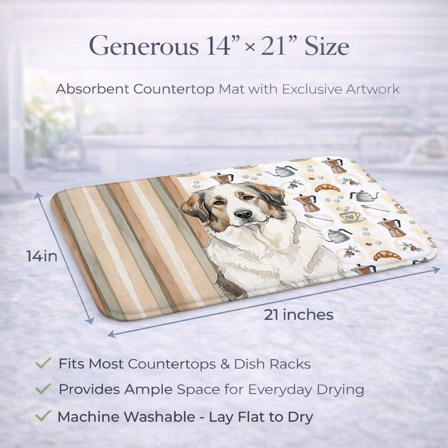 Shown here is the Badger Great Pyrenees Coffee Bar Dish Drying Mat from Caroline's Treasures featuring artwork of a Great Pyrenees in a Everyday design. The detailed illustration and vibrant colors make it a standout accent that celebrates both seasonal style and love for the subject. This image features a cozy watercolor coffee-themed pattern with illustrated mugs, moka pots, kettles, croissants, coffee beans, and sugar cubes arranged in a repeating design. Soft neutral tones with warm browns, creams, and subtle sage accents create an inviting, café-inspired look that feels comforting and relaxed. Everyday décor celebrates personal style and the small moments that make a house feel like home. Thoughtful designs add warmth and personality that can be enjoyed year-round. Say goodbye to messy countertops and soggy dish towels with our innovative dish drying mat. Our high-quality dish drying pad is designed to keep your countertops dry while offering a stylish and efficient solution. Whether you're air drying dishes, glasses, stemware, silverware, pots, pans, bottles, or even fruits and vegetables, our dish mat is the perfect choice. The 14 inches x 21 inches size fits most counters and dish drying racks, and the non-slip design ensures stability. Made with water-absorbent polyester and a polyurethane foam insert, our dish drying mat is not only functional but also durable. It's machine washable and printed in the USA for long-lasting use. The beautiful artwork adds flair to your kitchen decor, making it a perfect housewarming gift or present for any occasion. Upgrade your kitchen experience with our absorbent and versatile dish drying mat. Perfect for: Kitchen counters and sinks, everyday dish drying and countertop protection, Dogs-themed homes, or year-round use for Great Pyrenees lovers. Great Pyrenees dogs are large guardian breeds known for their calm confidence and protective instincts. This mountain breed is admired for its loyalty, patience, and steady vigilance. Makes a heartfelt gift for: Great Pyrenees owners, Dogs lovers, Everyday gifts, pet parents, friends who adore their Great Pyrenees, or anyone celebrating Dogs.