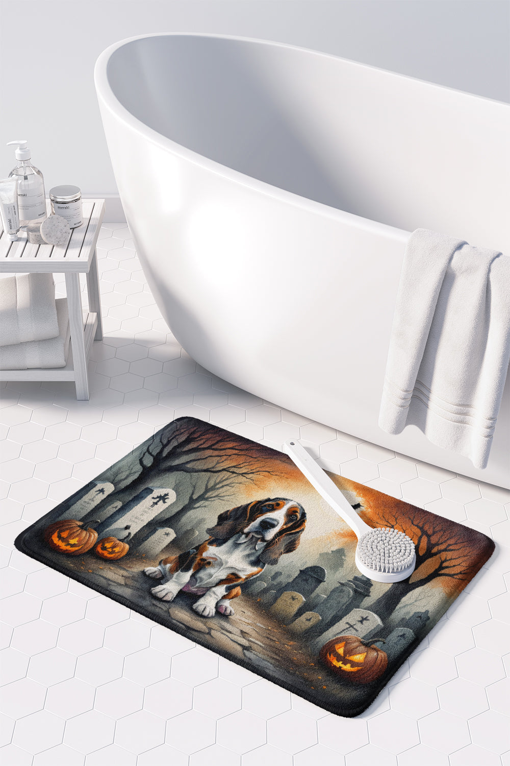 Decorate your space with our Halloween Basset Hound artwork on a Floor Mat. Transform your floor into a work of art with Caroline's Treasures' Memory Foam Mat. This mat offers not only a stunning visual appeal but also a luxurious, plush feel that's incredibly comfortable to the touch. It's a versatile, machine-washable mat designed for both bath and kitchen use, ensuring you experience the best in comfort and convenience. Care Instructions: Maintaining this memory foam mat is a breeze. Simply follow the care instructions on the product tag. It's recommended to wash in cold water and dry on a low-temperature setting in the dryer. This ensures the mat retains its quality and longevity, allowing you to enjoy its beauty and comfort for a long time. Caroline's Treasures' Memory Foam Mat Machine Washable is the perfect blend of artistry, comfort, and practicality, making it a standout addition to any space. Upgrade your home decor with this versatile and stylish mat today.
