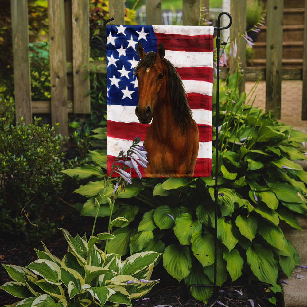 Garden Flag featuring breed specific Morgan artwork. Enhance the beauty of your garden, patio, or yard with Caroline's Treasures Decorative Garden Flag, proudly made in the USA. Crafted from two pieces of thick, double-sided polyester fabric, this 2-ply garden flag is designed to withstand various weather conditions, making it water-resistant and weatherproof. Featuring correctly readable words on both sides, this garden flag offers a delightful visual experience from any angle. With its heavier weight, it stands out among other garden flags, ensuring stability and durability even in wind, rain, and snow. Measuring approximately 11 1/4 inches by 15 1/2 inches, this flag allows you to personalize your outdoor decor. It comes with a 1 1/2-inch sleeve sewn in, allowing easy attachment to any standard garden flag stand or garden size porch hanger (sold separately). Make a statement in your outdoor space with Caroline's Treasures Decorative Garden Flag, a vibrant and high-quality flag that adds color and personality to your surroundings. Proudly made in the USA, it's a symbol of quality craftsmanship and attention to detail.