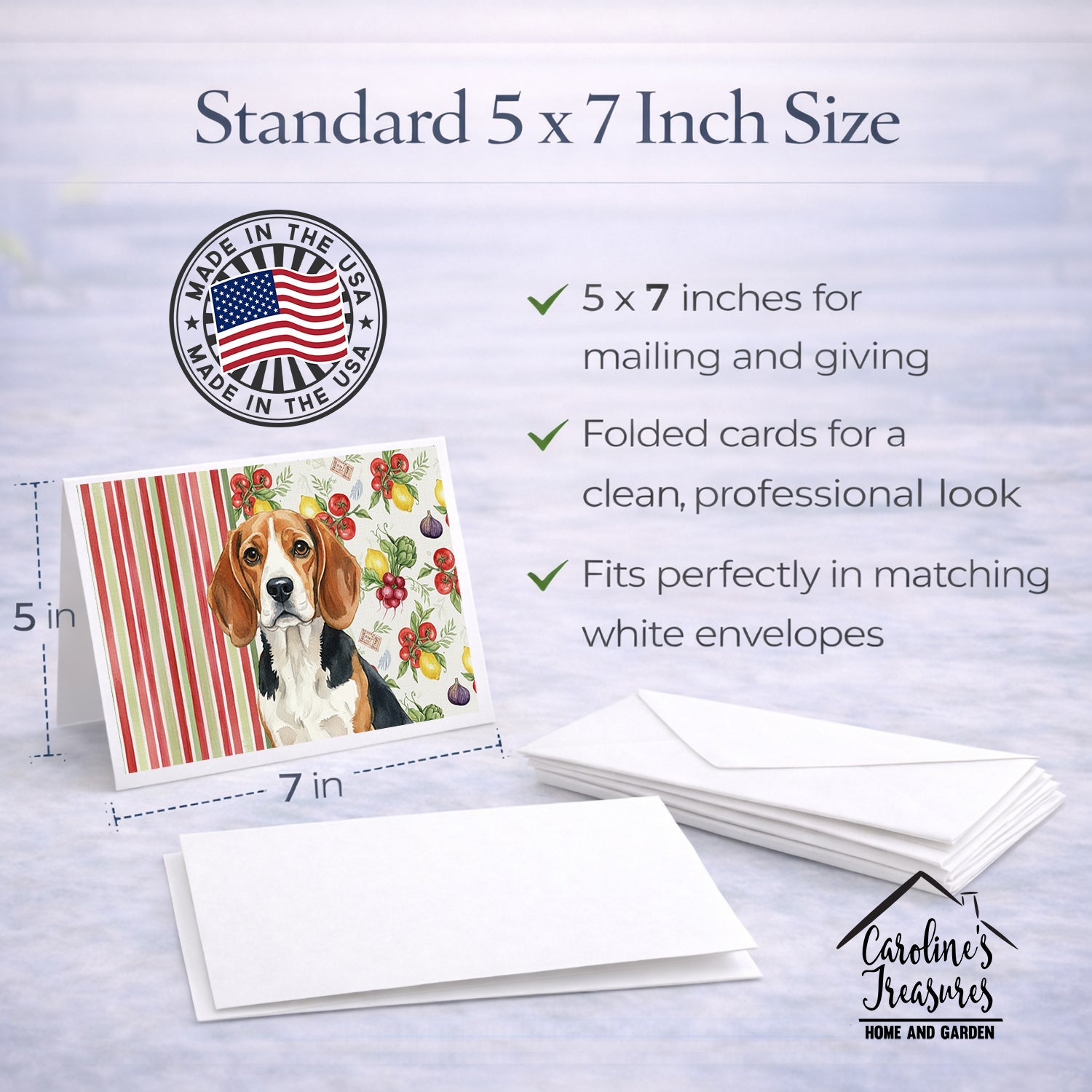 Shown here is the Beagle Vegetables Greeting Cards Pack of 8 from Caroline's Treasures featuring artwork of a Beagle in a Everyday design. The detailed illustration and vibrant colors make it a standout accent that celebrates both seasonal style and love for the subject. This image features a vibrant watercolor vegetable pattern with tomatoes, lemons, artichokes, figs, radishes, and leafy greens arranged in a repeating design, paired with classic red and green stripes. The bright, garden-fresh palette creates a cheerful, farmhouse-inspired look that feels lively, welcoming, and perfect for kitchen décor. Everyday décor celebrates personal style and the small moments that make a house feel like home. Thoughtful designs add warmth and personality that can be enjoyed year-round. Celebrate special moments with Caroline's Treasures Printed Greeting Card Pack. This pack includes eight beautifully folded 5x7 cards, accompanied by eight matching white envelopes. With blank interiors, these cards provide ample space for your personalized messages and heartfelt holiday greetings. Each card features captivating full-color artwork, meticulously printed in our facility on high-quality 80 lb cover stock or 216 GSM. The super smooth finish of the white cards enhances the visual impact of the artwork, creating a truly stunning presentation. Designed by our talented in-house artists or licensed artists, the artwork on these cards showcases their creativity and attention to detail. From vibrant illustrations to captivating designs, each card tells its own unique story. Whether it's for birthdays, anniversaries, holidays, or any special occasion, Caroline's Treasures Greeting Card Pack is the perfect way to convey your heartfelt sentiments. Share joy, love, and warm wishes with these exquisite cards and make every moment unforgettable. Perfect for: Writing personal messages, everyday correspondence, and thoughtful notes, Dogs-themed stationery collections, or year-round use for Beagle lovers. Beagles are friendly scent hounds known for their curiosity, intelligence, and cheerful disposition. Popular with families, this breed is valued for its affectionate nature and love of exploration. Makes a heartfelt gift for: Beagle owners, Dogs lovers, Everyday gifts, pet parents, friends who adore their Beagle, or anyone celebrating Dogs.
