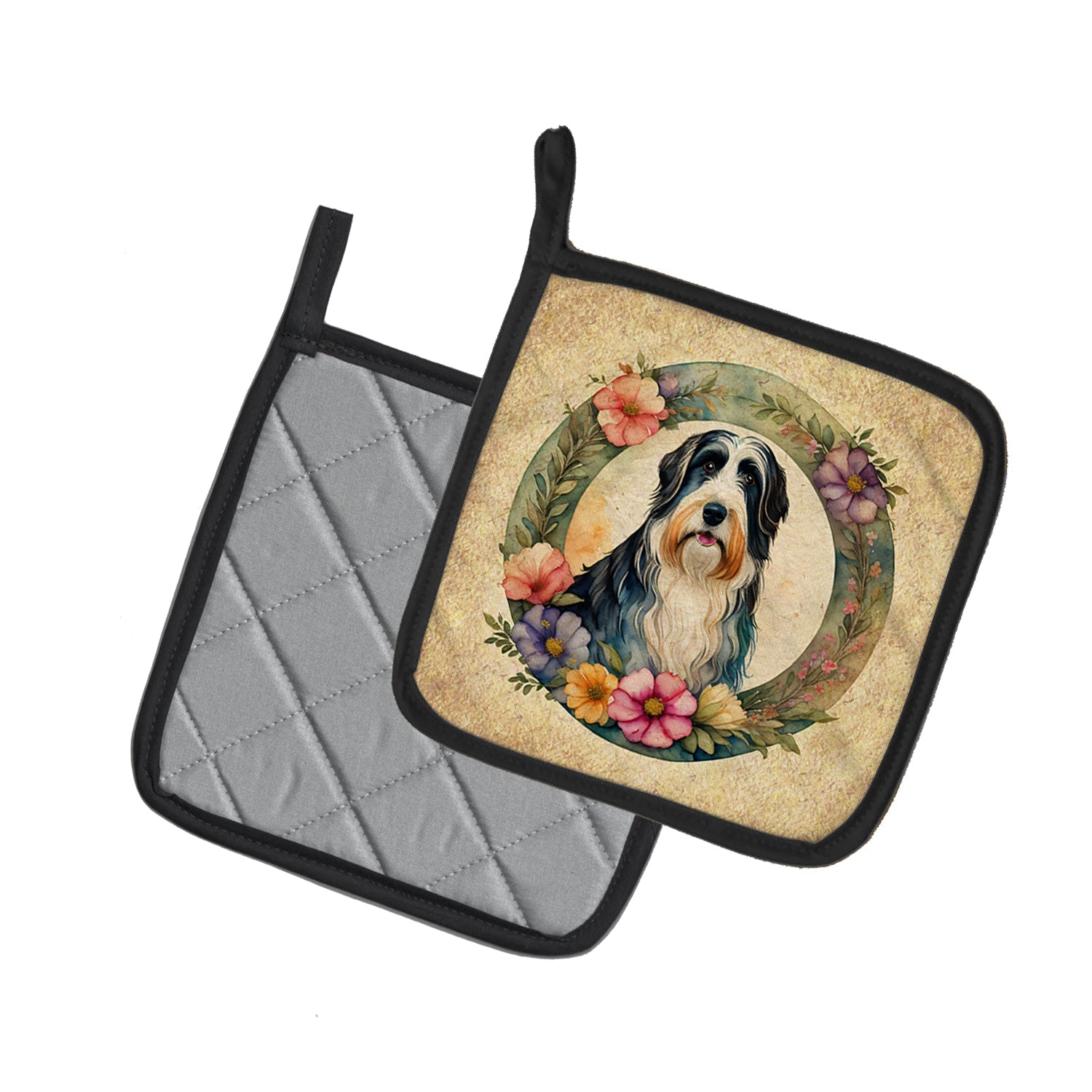 Decorate your space with our Bearded Collie artwork on a Pair of Pot Holders. Bring a bit of Spring into your home with a Spring Pair of Pot Holders. A Pair of Pot Holders to match your kitchen decor. Made in the USA these are thick and functional. Full color artwork decorates the front polyester fabric of the hot pad and accented by a black trim. Use these at as a trivet for your Thanksgiving or Christmas tablescape. Filled with insulated fabric and quilted for durability. These colorful pot holders will make a great gift for your favorite home cook or executive chef. Each pot holder measures approximately 7 1/2 inches by 7 1/2 inches. A hanging tab is included.