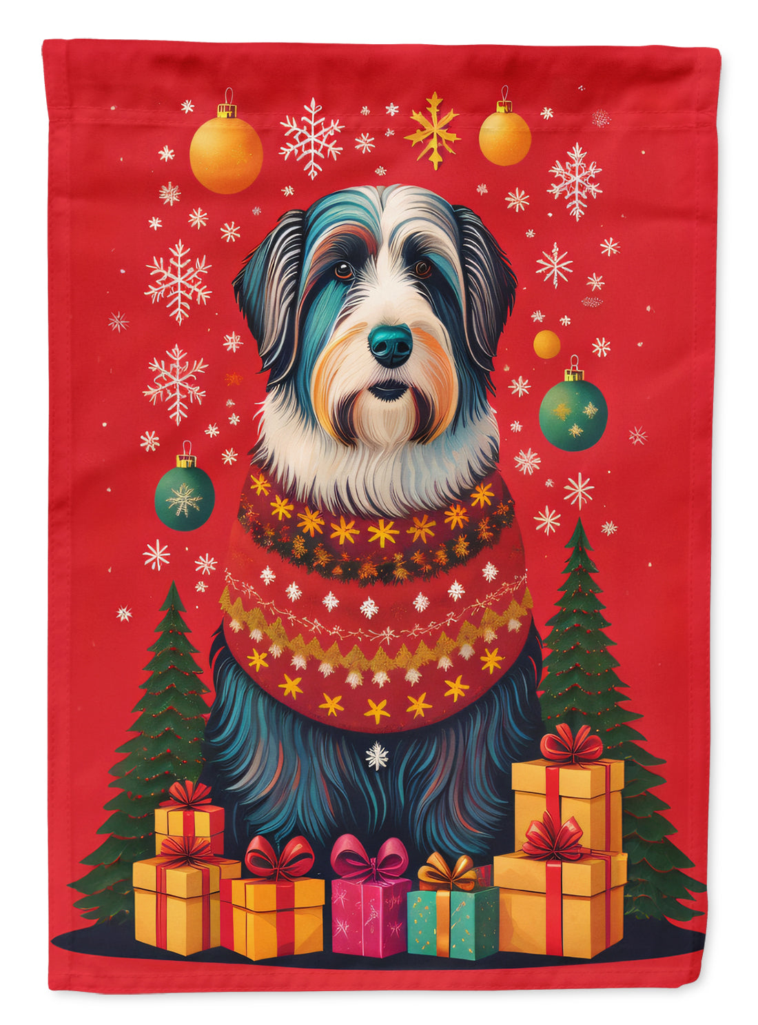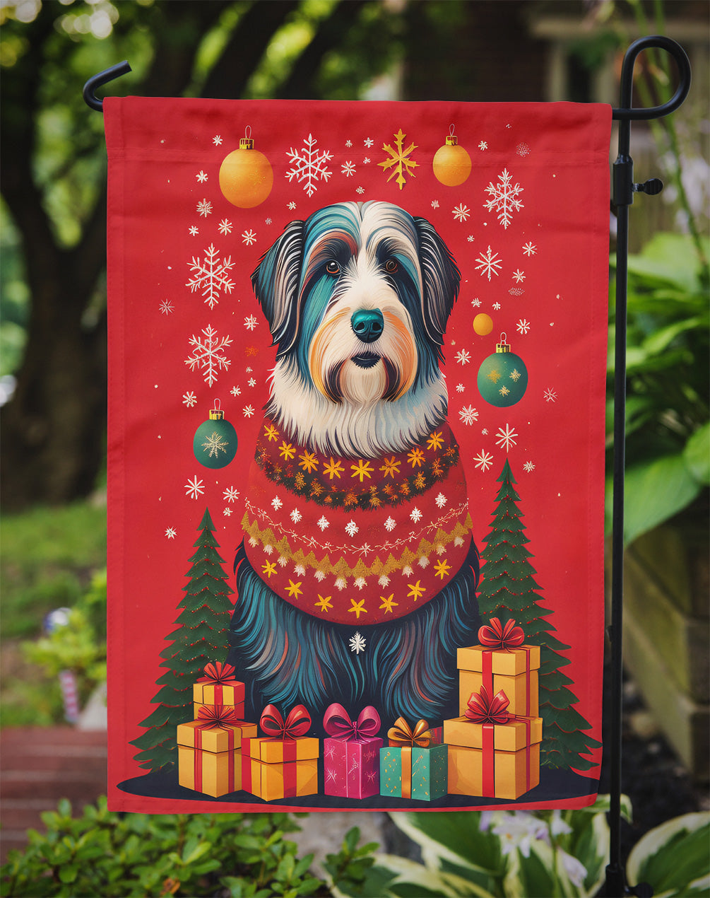 Decorate your space with our Christmas Bearded Collie artwork on a Garden Flag. Enhance the beauty of your garden, patio, or yard with Caroline's Treasures Decorative Garden Flag, proudly made in the USA. Crafted from two pieces of thick, double-sided polyester fabric, this 2-ply garden flag is designed to withstand various weather conditions, making it water-resistant and weatherproof. Featuring correctly readable words on both sides, this garden flag offers a delightful visual experience from any angle. With its heavier weight, it stands out among other garden flags, ensuring stability and durability even in wind, rain, and snow. Measuring approximately 11 1/4 inches by 15 1/2 inches, this flag allows you to personalize your outdoor decor. It comes with a 1 1/2-inch sleeve sewn in, allowing easy attachment to any standard garden flag stand or garden size porch hanger (sold separately). Make a statement in your outdoor space with Caroline's Treasures Decorative Garden Flag, a vibrant and high-quality flag that adds color and personality to your surroundings. Proudly made in the USA, it's a symbol of quality craftsmanship and attention to detail.