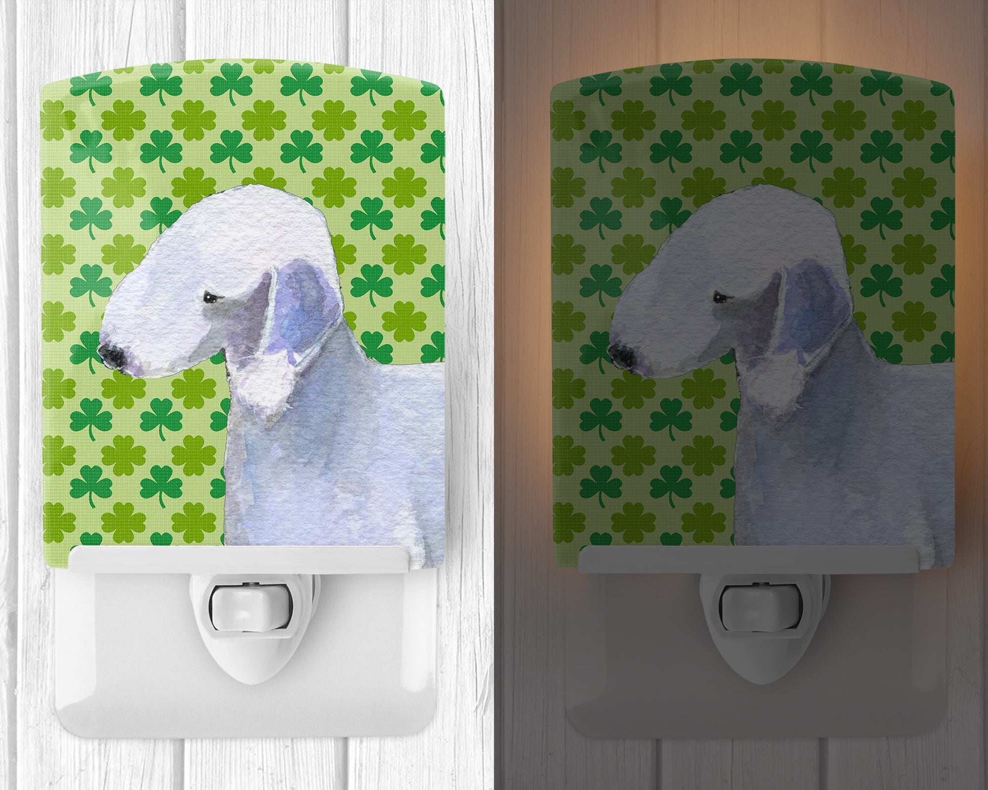 Decorate your space with our St Patrick's Day Bedlington Terrier artwork on a Night Light. Introduce a splash of artistic flair and subtle illumination to your space with the Decorative Ceramic Night Light from Caroline's Treasures. Perfect for any room, this night light seamlessly blends functionality with an aesthetic appeal, offering a stylish solution to brighten up dark corners of your home or office. Boasting a six-inch high by four-inch wide ceramic tile at the front, it showcases vivid, full-color artwork from distinguished artists, transforming a simple utility into a vibrant art piece. The artwork is securely encased in a robust metal holder, ensuring durability and longevity. Two screws are provided to firmly affix the tile into the holder. The holder extends three inches deep, housing an included bulb that emits a soft, welcoming glow. This product meets all safety standards, as evidenced by its UL approval. Proudly made in the United States from imported components, this Decorative Ceramic Night Light is not just a functional device; it's a statement piece that enhances the ambiance of your surroundings.