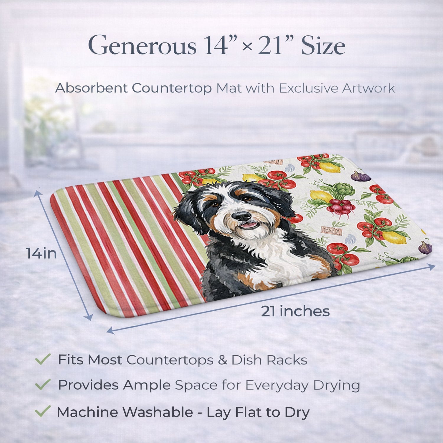 Shown here is the Berndoodle Vegetables Dish Drying Mat from Caroline's Treasures featuring artwork of a Berndoodle in a Everyday design. The detailed illustration and vibrant colors make it a standout accent that celebrates both seasonal style and love for the subject. This image features a vibrant watercolor vegetable pattern with tomatoes, lemons, artichokes, figs, radishes, and leafy greens arranged in a repeating design, paired with classic red and green stripes. The bright, garden-fresh palette creates a cheerful, farmhouse-inspired look that feels lively, welcoming, and perfect for kitchen décor. Everyday décor celebrates personal style and the small moments that make a house feel like home. Thoughtful designs add warmth and personality that can be enjoyed year-round. Say goodbye to messy countertops and soggy dish towels with our innovative dish drying mat. Our high-quality dish drying pad is designed to keep your countertops dry while offering a stylish and efficient solution. Whether you're air drying dishes, glasses, stemware, silverware, pots, pans, bottles, or even fruits and vegetables, our dish mat is the perfect choice. The 14 inches x 21 inches size fits most counters and dish drying racks, and the non-slip design ensures stability. Made with water-absorbent polyester and a polyurethane foam insert, our dish drying mat is not only functional but also durable. It's machine washable and printed in the USA for long-lasting use. The beautiful artwork adds flair to your kitchen decor, making it a perfect housewarming gift or present for any occasion. Upgrade your kitchen experience with our absorbent and versatile dish drying mat. Perfect for: Kitchen counters and sinks, everyday dish drying and countertop protection, Dogs-themed homes, or year-round use for Berndoodle lovers. Berndoodles combine a soft coat with a friendly appearance. Their look reflects warmth and approachability. Makes a heartfelt gift for: Berndoodle owners, Dogs lovers, Everyday gifts, pet parents, friends who adore their Berndoodle, or anyone celebrating Dogs.