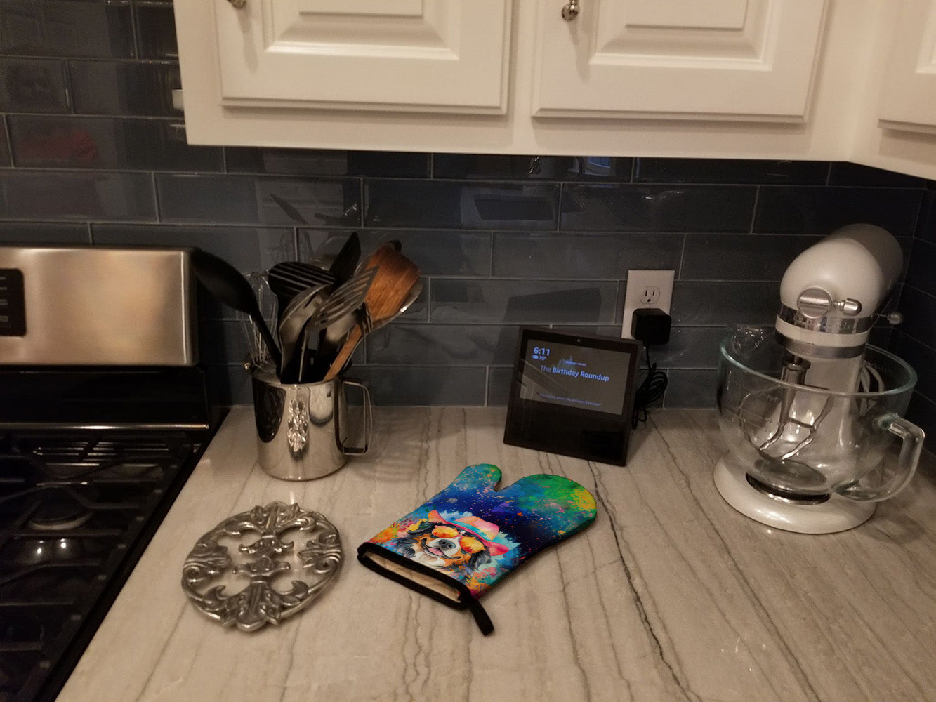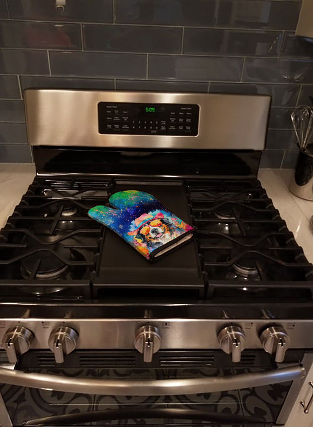Decorate your space with our Bernese Mountain Dog artwork on a Oven Mitt. Bring a bit of Summer into your home with a Summer Oven Mitt. Presenting our Large Right Hand Thick Heat Resistant Oven Mitt, an indispensable tool for any culinary enthusiast. This mitt boasts layers of quilted protection on both sides, providing outstanding resistance against extreme heat. Embellished with beautifully printed artwork, it adds an extra dash of charm to your kitchen decor. At about 12 inches long and 8 1/2 inches wide, this oven mitt offers a generous fit, accommodating a diverse range of hand sizes. Its design is enhanced by a sleek Black bias tape trim, finished with a convenient hoop for easy hanging. Fresh out of the packaging, the quilting process may give the mitt a stiff feel, but rest assured, it will soften with use and washing. Our mitt is crafted with a unique center fabric, Insul-Bright, a composite material made from polyester fibers, needle-punched through a nonwoven substrate and a reflective metallized film. This smart material resists both conduction and radiant energy, reflecting heat back to its source, all while remaining breathable. Our oven mitt is machine washable and safe for tumble drying. It's a perfect gift for your favorite Chef, BBQ enthusiast, or just a little treat for yourself! Experience safety, style, and convenience rolled into one with this exceptional oven mitt.
