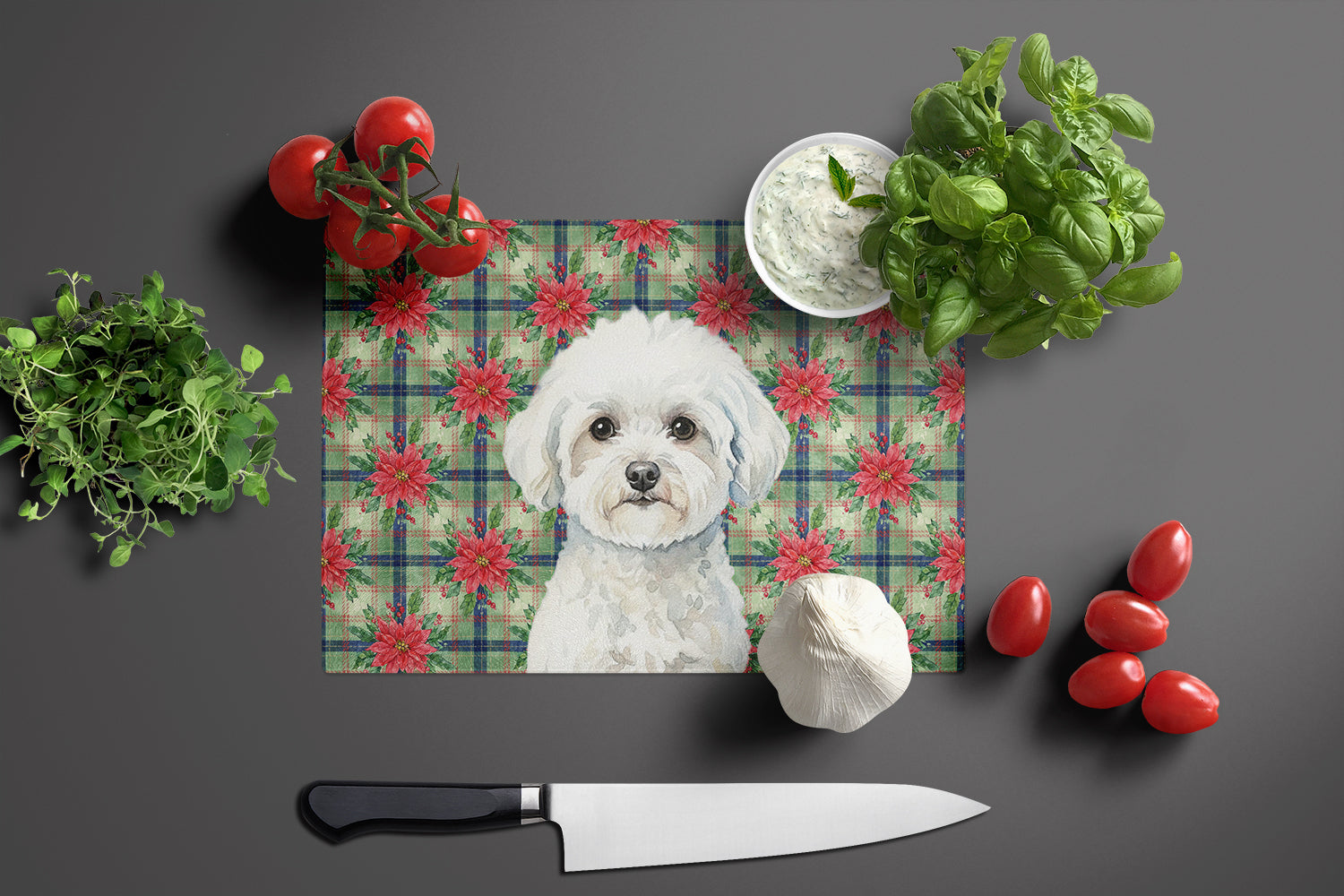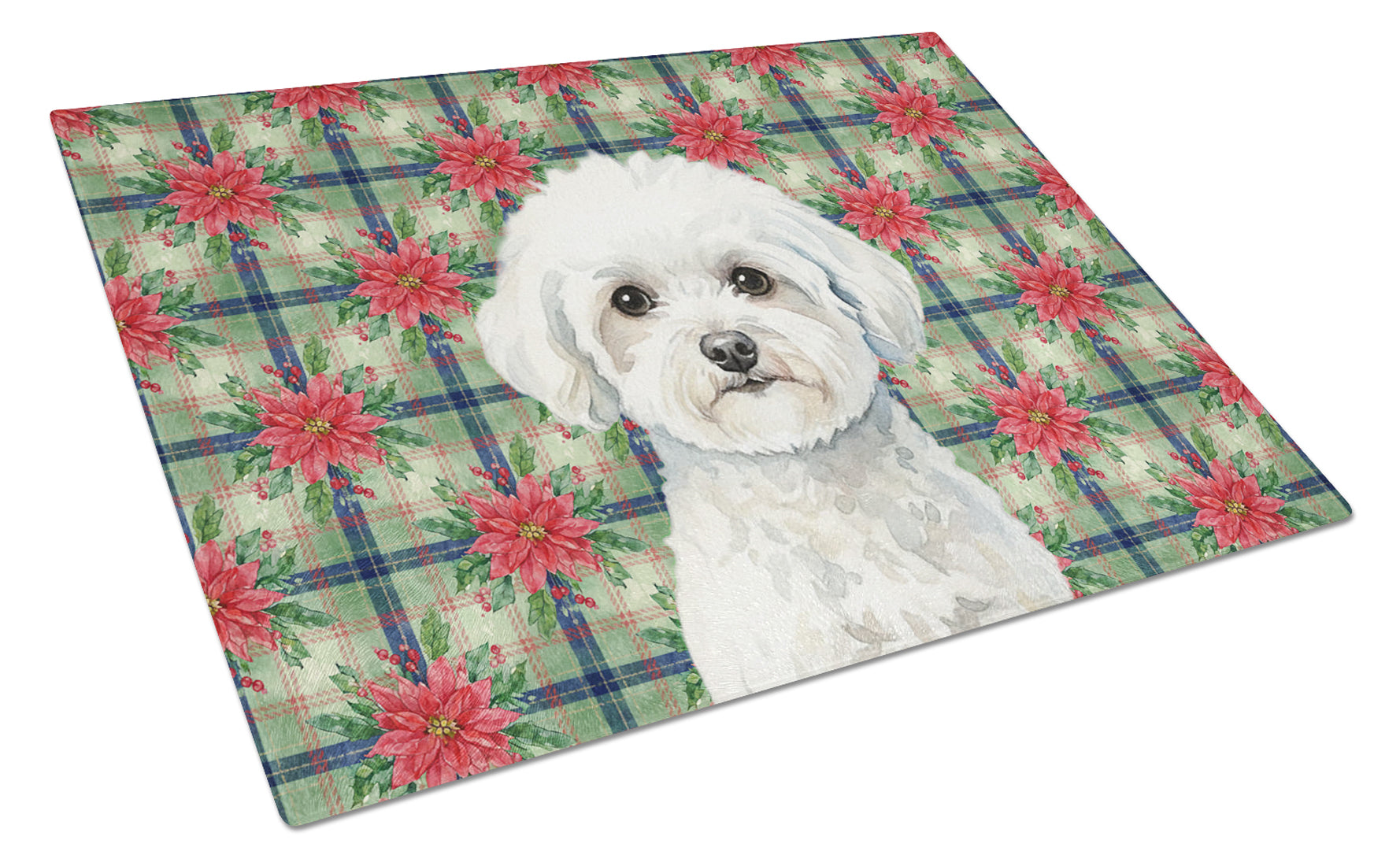 Bichon Frise Christmas PoinsettIas Glass Cutting Board