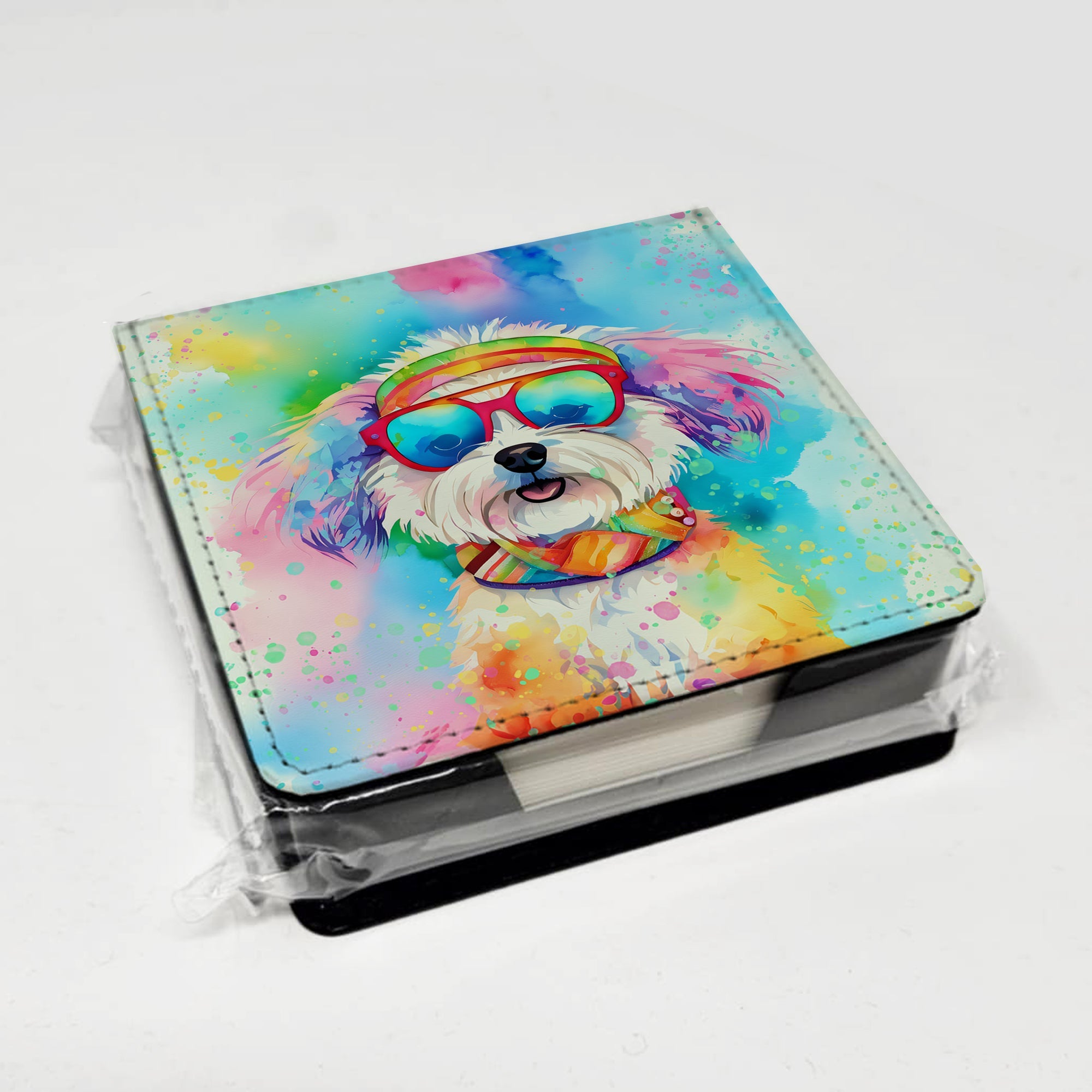 PU Leather Note Paper Holder featuring breed specific Bichon Frise artwork. Elevate your workspace with this PU Leather Note Paper Holder, crafted to resemble luxurious leather without the use of animal products. Made from durable synthetic PU leather, it offers both a premium look and eco-friendly appeal. This note holder, compactly sized at 4.25 x 4.25 x 1.25 inches, includes about 160 sheets of 3.75 x 3.75-inch note paper—ideal for quick notes and reminders. An exclusive artist-designed cover makes each holder uniquely vibrant, adding a splash of color and personality to any desk or office. The discrete design keeps note paper hidden, maintaining a neat and organized workspace. Perfect as a gift or for personal use, this stylish holder is refillable with standard paper, ensuring long-lasting utility. A must-have for anyone seeking a sophisticated, artful touch to their workspace while supporting animal-friendly products. Add style, organization, and creativity to your everyday routine with this elegant note paper holder.