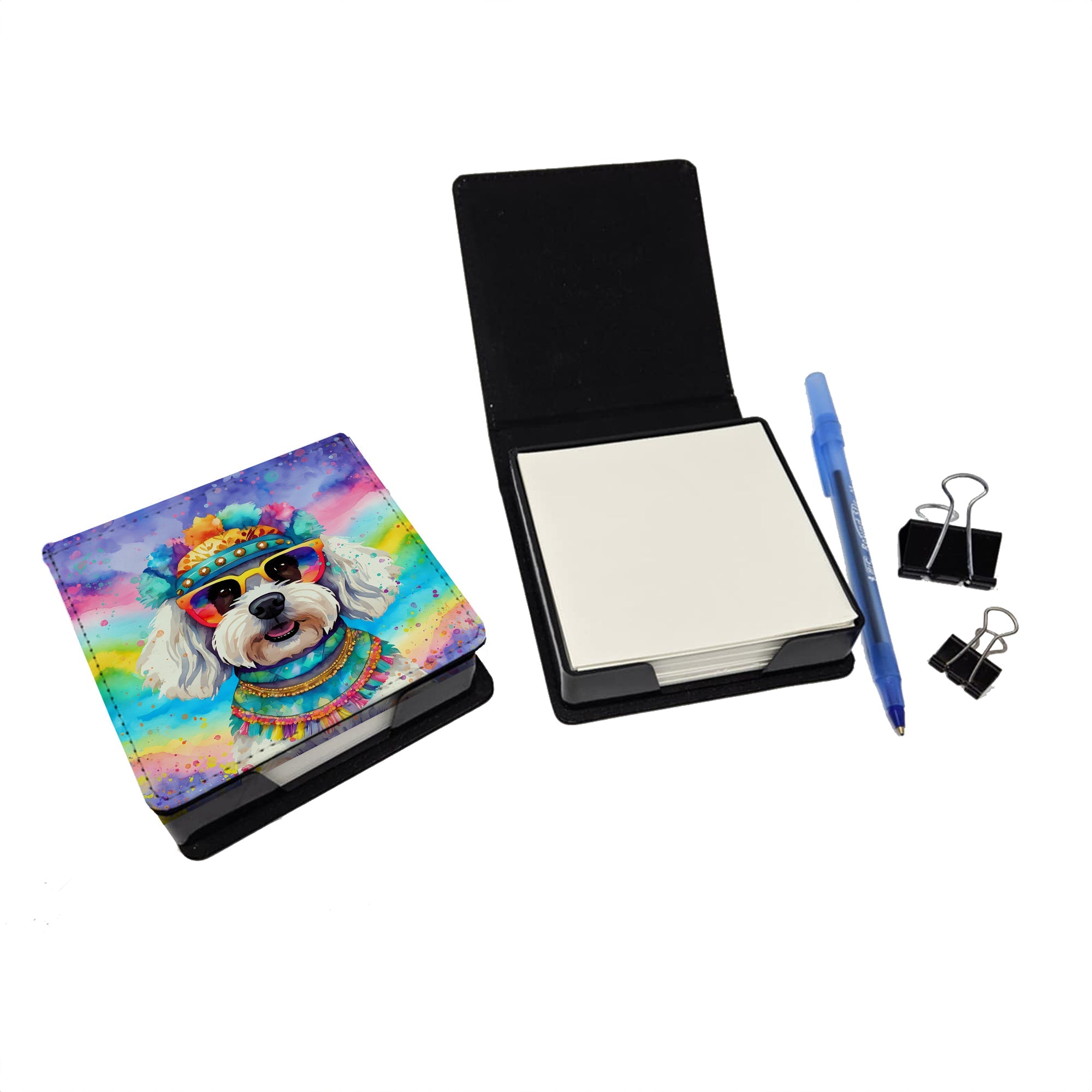 PU Leather Note Paper Holder featuring breed specific Bichon Frise artwork. Elevate your workspace with this PU Leather Note Paper Holder, crafted to resemble luxurious leather without the use of animal products. Made from durable synthetic PU leather, it offers both a premium look and eco-friendly appeal. This note holder, compactly sized at 4.25 x 4.25 x 1.25 inches, includes about 160 sheets of 3.75 x 3.75-inch note paper—ideal for quick notes and reminders. An exclusive artist-designed cover makes each holder uniquely vibrant, adding a splash of color and personality to any desk or office. The discrete design keeps note paper hidden, maintaining a neat and organized workspace. Perfect as a gift or for personal use, this stylish holder is refillable with standard paper, ensuring long-lasting utility. A must-have for anyone seeking a sophisticated, artful touch to their workspace while supporting animal-friendly products. Add style, organization, and creativity to your everyday routine with this elegant note paper holder.
