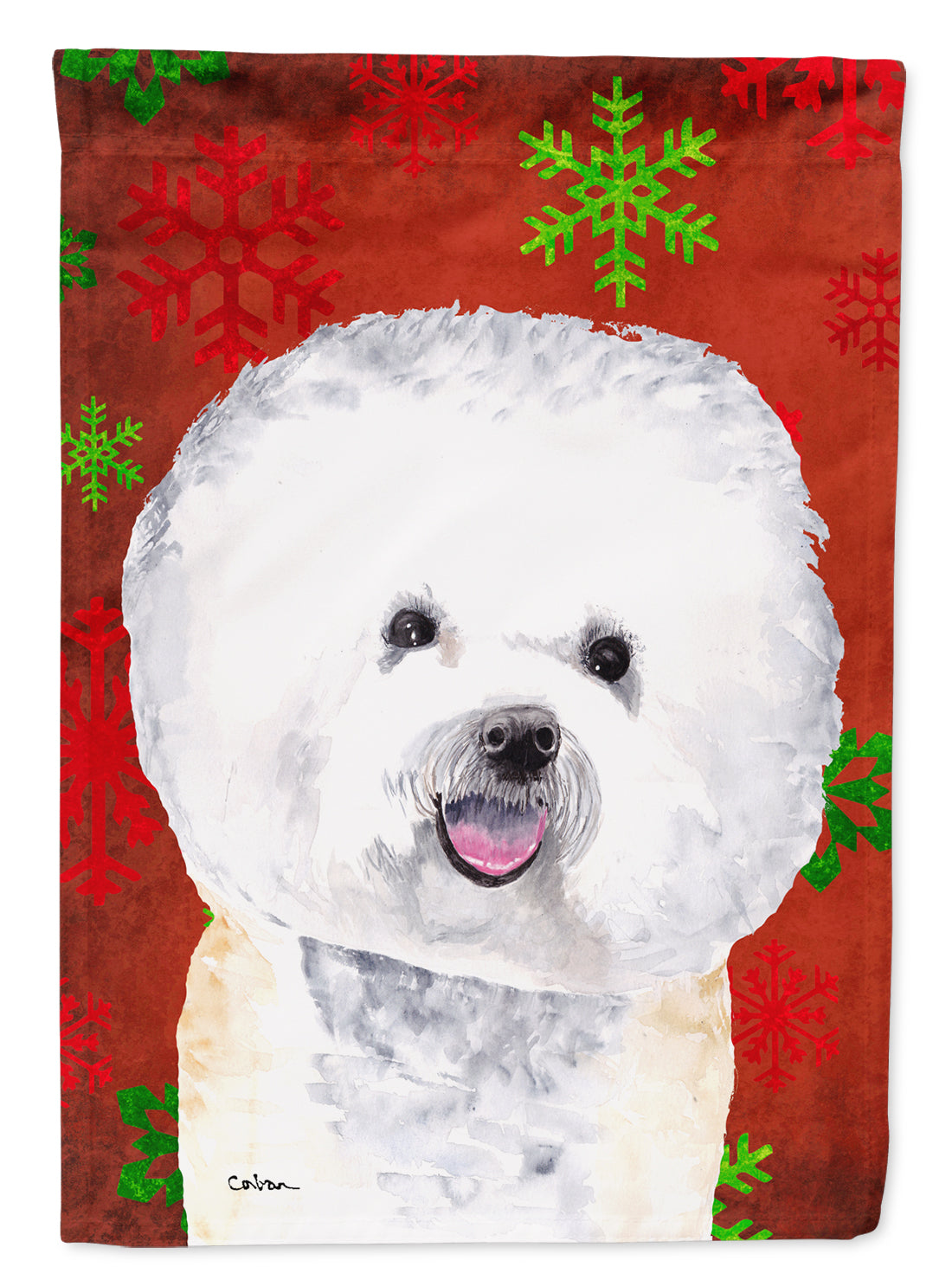 Decorate your space with our Christmas Bichon Frise artwork on a Garden Flag. Enhance the beauty of your garden, patio, or yard with Caroline's Treasures Decorative Garden Flag, proudly made in the USA. Crafted from two pieces of thick, double-sided polyester fabric, this 2-ply garden flag is designed to withstand various weather conditions, making it water-resistant and weatherproof. Featuring correctly readable words on both sides, this garden flag offers a delightful visual experience from any angle. With its heavier weight, it stands out among other garden flags, ensuring stability and durability even in wind, rain, and snow. Measuring approximately 11 1/4 inches by 15 1/2 inches, this flag allows you to personalize your outdoor decor. It comes with a 1 1/2-inch sleeve sewn in, allowing easy attachment to any standard garden flag stand or garden size porch hanger (sold separately). Make a statement in your outdoor space with Caroline's Treasures Decorative Garden Flag, a vibrant and high-quality flag that adds color and personality to your surroundings. Proudly made in the USA, it's a symbol of quality craftsmanship and attention to detail.