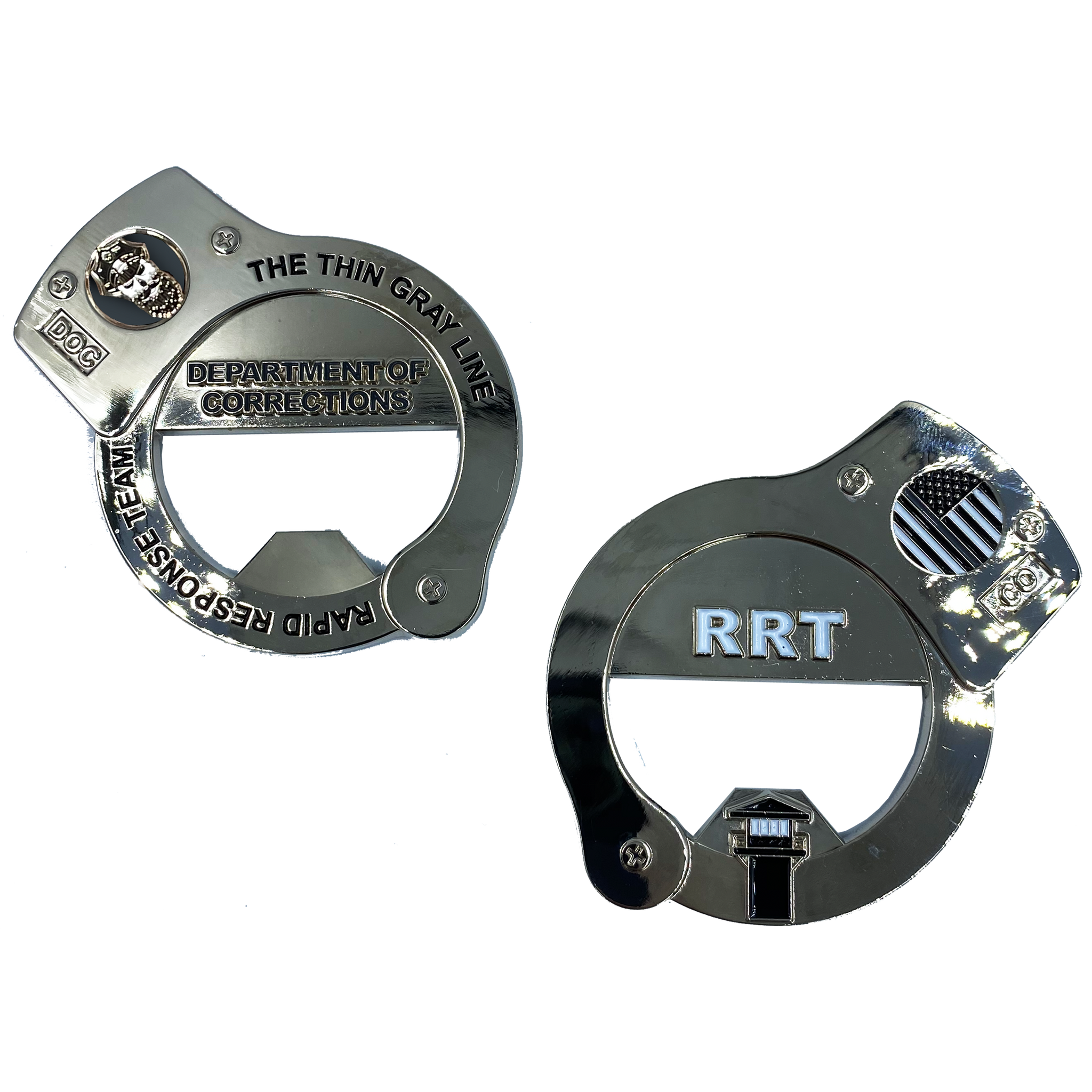 BL3-001 RRT Rapid Response Team Thin Gray Line HANDCUFFs Beard Gang Skull Challenge Coin Bottle Opener Corrections Correctional Officer