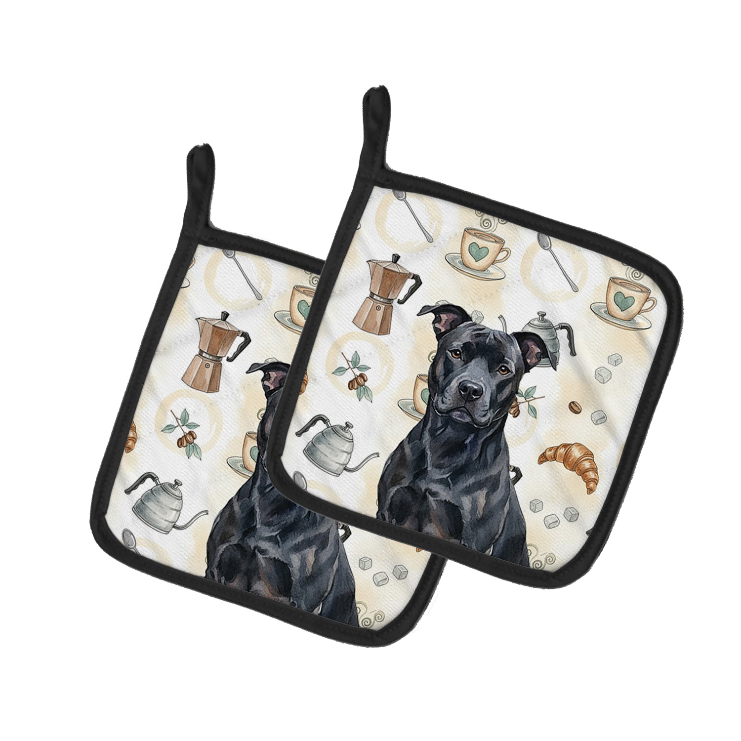 Pair of Pot Holders featuring breed specific American Staffordshire Terrier artwork. Add warmth, personality, and function to your kitchen with our Coffee Time Pot Holder Pair. Each set includes two quilted hot pads, featuring original full-color watercolor artwork on a soft polyester front accented by black trim. Crafted with multiple layers for performance: Top Layer: Vibrant artwork permanently dyed into polyester fabric. Middle Layer: US-manufactured insulated material with breathable polyester fibers and a reflective metalized film that reflects heat back to its source. Bottom Layer: A silver heat-resistant backing for extra protection. Each pot holder measures 7.5" x 7.5", includes a hanging tab, and is quilted for durability. Use them to protect your hands, countertops, and tabletops — or as decorative trivets for Thanksgiving, Christmas, or everyday meals.