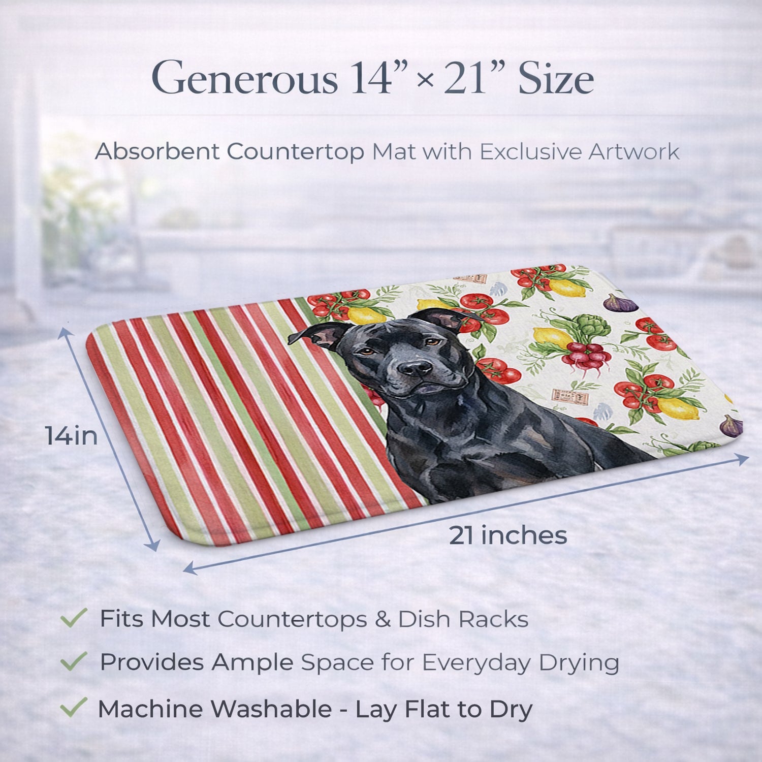 Shown here is the Black American Staffordshire Terrier Vegetables Dish Drying Mat from Caroline's Treasures featuring artwork of a American Staffordshire Terrier in a Everyday design. The detailed illustration and vibrant colors make it a standout accent that celebrates both seasonal style and love for the subject. This image features a vibrant watercolor vegetable pattern with tomatoes, lemons, artichokes, figs, radishes, and leafy greens arranged in a repeating design, paired with classic red and green stripes. The bright, garden-fresh palette creates a cheerful, farmhouse-inspired look that feels lively, welcoming, and perfect for kitchen décor. Everyday décor celebrates personal style and the small moments that make a house feel like home. Thoughtful designs add warmth and personality that can be enjoyed year-round. Say goodbye to messy countertops and soggy dish towels with our innovative dish drying mat. Our high-quality dish drying pad is designed to keep your countertops dry while offering a stylish and efficient solution. Whether you're air drying dishes, glasses, stemware, silverware, pots, pans, bottles, or even fruits and vegetables, our dish mat is the perfect choice. The 14 inches x 21 inches size fits most counters and dish drying racks, and the non-slip design ensures stability. Made with water-absorbent polyester and a polyurethane foam insert, our dish drying mat is not only functional but also durable. It's machine washable and printed in the USA for long-lasting use. The beautiful artwork adds flair to your kitchen decor, making it a perfect housewarming gift or present for any occasion. Upgrade your kitchen experience with our absorbent and versatile dish drying mat. Perfect for: Kitchen counters and sinks, everyday dish drying and countertop protection, Dogs-themed homes, or year-round use for American Staffordshire Terrier lovers. American Staffordshire Terriers are muscular dogs with confident posture. Their strong build reflects loyalty and courage. Makes a heartfelt gift for: American Staffordshire Terrier owners, Dogs lovers, Everyday gifts, pet parents, friends who adore their American Staffordshire Terrier, or anyone celebrating Dogs.