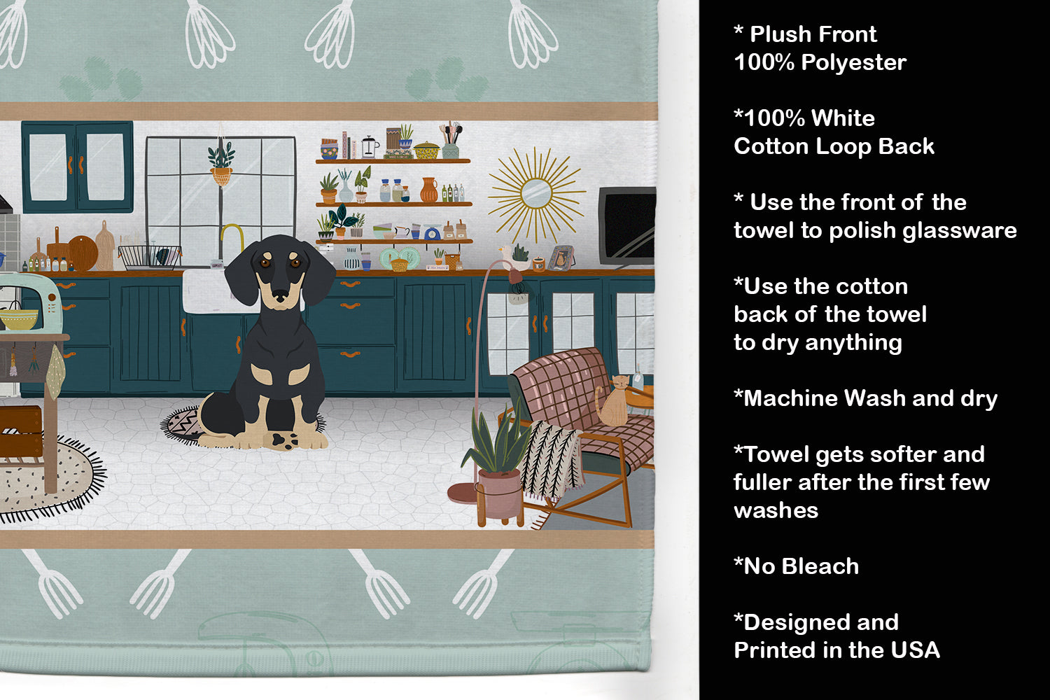 Decorate your space with our Dachshund artwork on a Kitchen Towel. Experience the perfect blend of aesthetic appeal and functional excellence with our Plush Velour Kitchen Towels. These are not your ordinary decorative kitchen towels that gather dust. Instead, they are designed to be as practical as they are stylish. The front layer of our towel is constructed from a minky plush polyester, known for its durability and color retention. Unlike conventional kitchen towels, the artwork on our towels is dyed directly into the fabric, ensuring vibrant colors that last. Polish your glassware to a brilliant sparkle using the plush front side of the towel. Flip to the back, crafted from 100% cotton terry loop, to exploit its exceptional absorbency for drying dishes or wiping down counters. Our kitchen towels redefine the concept of functional art, offering lasting quality that maintains the towel's shape over time. Measuring 15 inches by 25 inches and weighing 2.3 lbs per dozen, these towels deliver an overwhelming sensory experience with their soft, plush, and smooth texture. The edges are meticulously finished with binding, enhancing their durability and visual appeal. For your convenience, these towels are machine washable and can be dried on low heat. After the first wash, the top fabric becomes even softer and fluffier, eliminating the need for ironing. Treat your kitchen to the luxury and functionality it deserves with our plush velour kitchen towels.