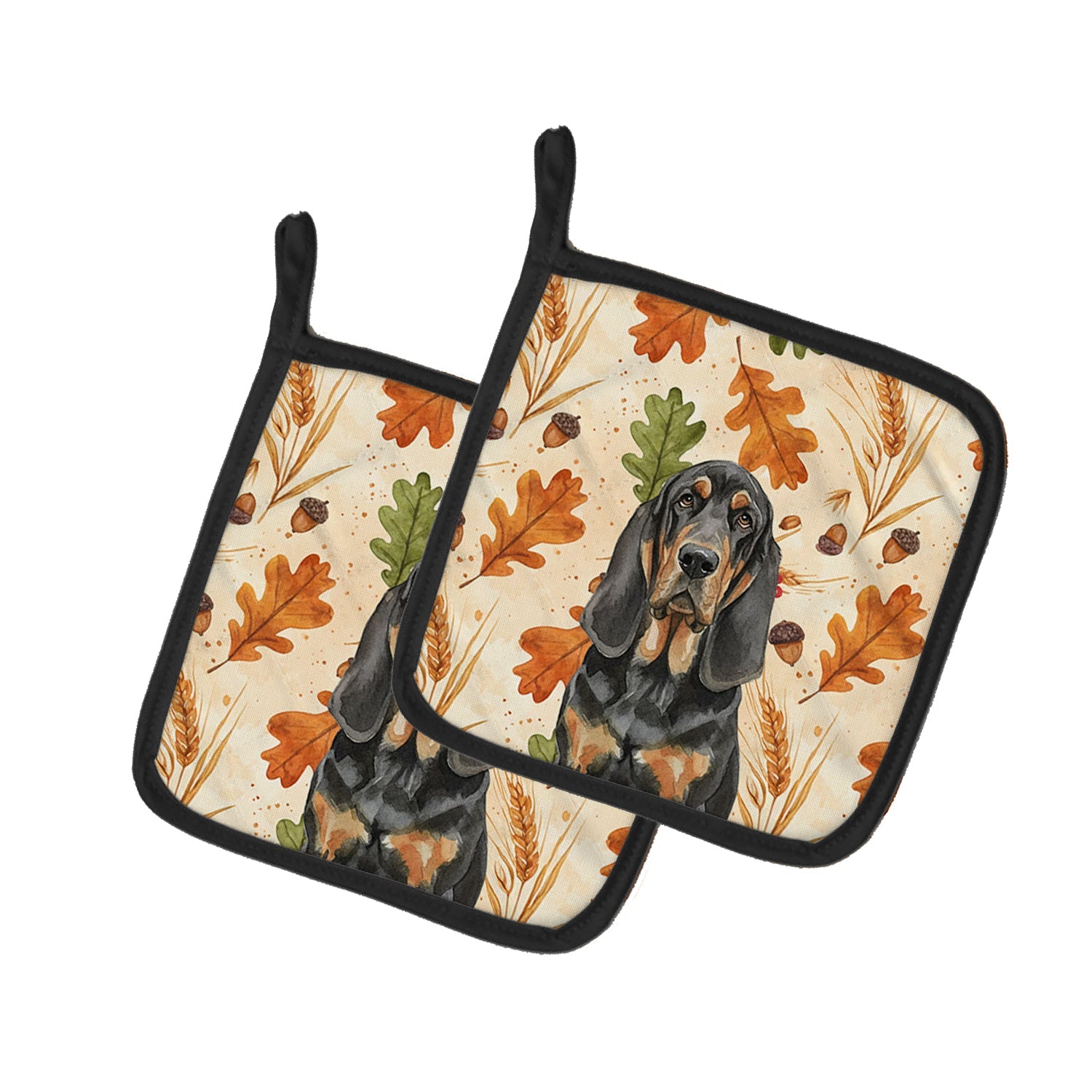 Pair of Pot Holders featuring breed specific Bloodhound artwork. Celebrate Thanksgiving with this Thanksgiving Pair of Pot Holders. Add warmth, personality, and function to your kitchen with our Heirloom Fall Pot Holder Pair. Each set includes two quilted hot pads, featuring original full-color watercolor artwork on a soft polyester front accented by black trim. Crafted with multiple layers for performance: Top Layer: Vibrant artwork permanently dyed into polyester fabric. Middle Layer: US-manufactured insulated material with breathable polyester fibers and a reflective metalized film that reflects heat back to its source. Bottom Layer: A silver heat-resistant backing for extra protection. Each pot holder measures 7.5" x 7.5", includes a hanging tab, and is quilted for durability. Use them to protect your hands, countertops, and tabletops — or as decorative trivets for Thanksgiving, Christmas, or everyday meals.