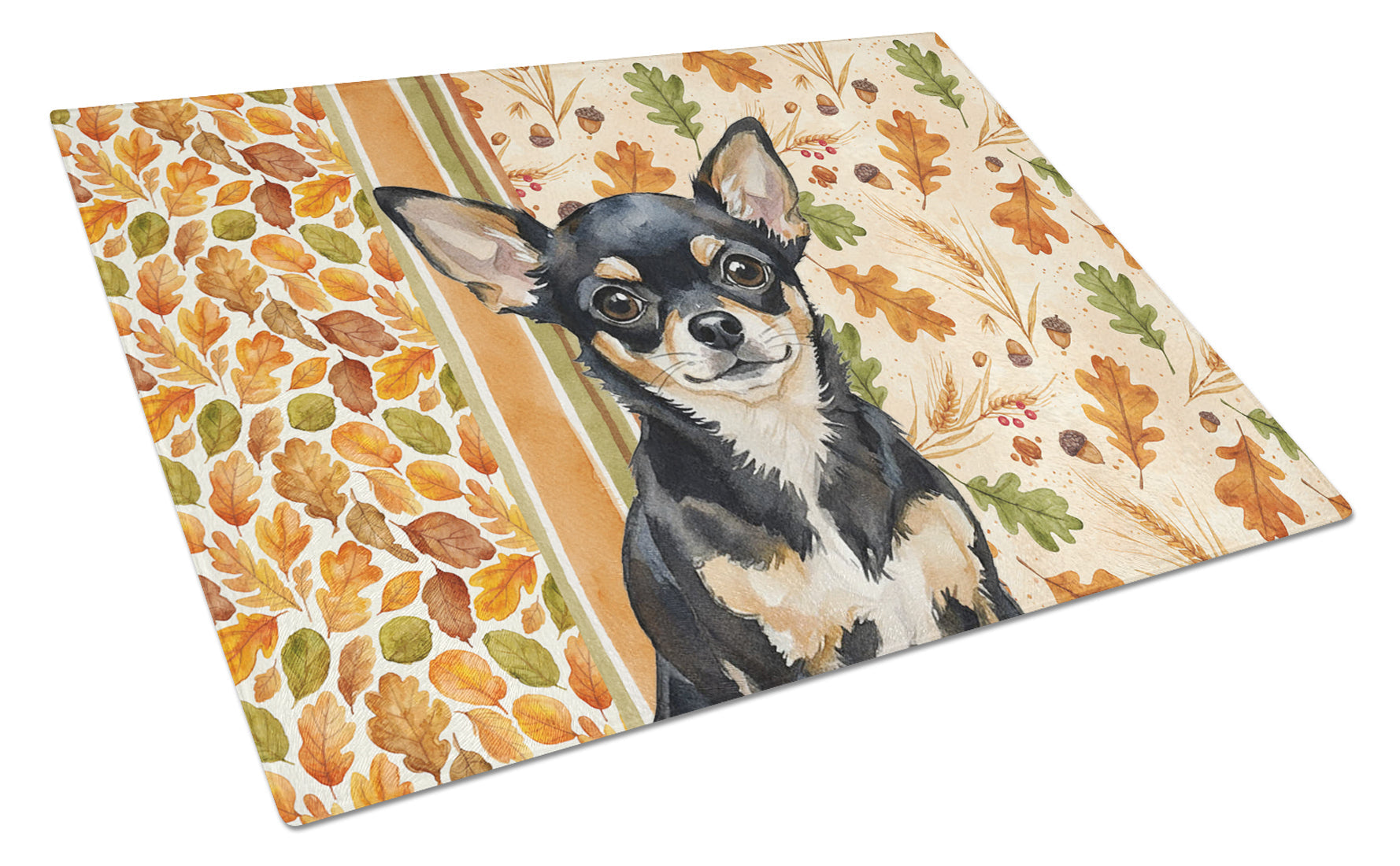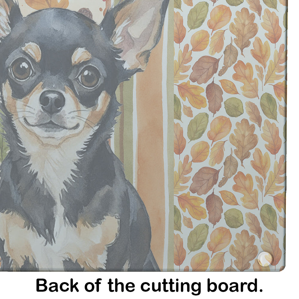 Glass Cutting Board featuring breed specific Chihuahua artwork. Celebrate Thanksgiving with this Thanksgiving Cutting Board. Introduce your kitchen to the vibrant, large Decorative Glass Cutting Board from Caroline's Treasures. Crafted from resilient tempered glass, this board is not only a utilitarian necessity but also a colorful art piece. With its generous dimensions of 15 inches in height and 12 inches in length, it offers ample space for all your cutting needs. Every piece showcases captivating artwork from distinguished artists, bringing an aesthetic edge to your kitchen. Beyond its attractive design, this cutting board ensures your countertop stays pristine and unscathed, owing to its heat-resistant properties. Engineered with user convenience in mind, it features non-skid feet for stability, and rounded corners for additional safety. Its robust construction renders it virtually unbreakable, guaranteeing longevity. The board comes with protective feet bumpers, maintaining its position during use. This product is recommended to be hand washed only. Proudly printed and assembled in the United States, this cutting board exemplifies superior craftsmanship. With Caroline's Treasures' Decorative Glass Cutting Board, you're investing in a blend of functionality and artistic flair.