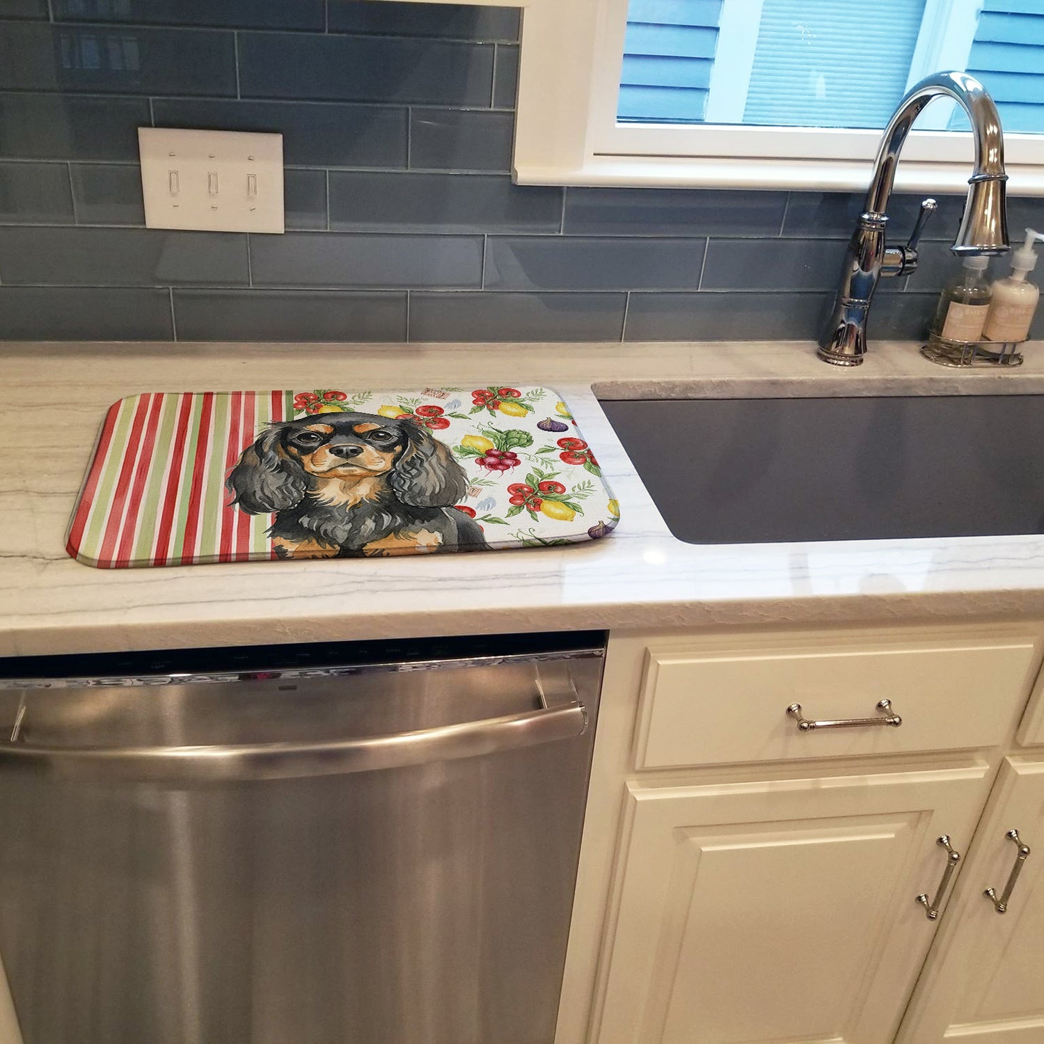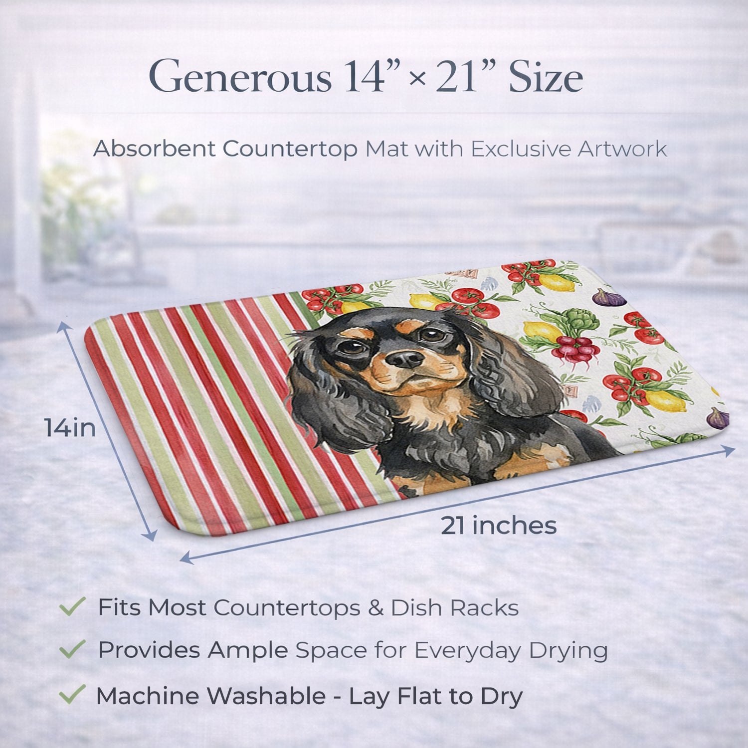 Shown here is the Black and Tan English Toy Spaniel Vegetables Dish Drying Mat from Caroline's Treasures featuring artwork of a English Toy Spaniel in a Everyday design. The detailed illustration and vibrant colors make it a standout accent that celebrates both seasonal style and love for the subject. This image features a vibrant watercolor vegetable pattern with tomatoes, lemons, artichokes, figs, radishes, and leafy greens arranged in a repeating design, paired with classic red and green stripes. The bright, garden-fresh palette creates a cheerful, farmhouse-inspired look that feels lively, welcoming, and perfect for kitchen décor. Everyday décor celebrates personal style and the small moments that make a house feel like home. Thoughtful designs add warmth and personality that can be enjoyed year-round. Say goodbye to messy countertops and soggy dish towels with our innovative dish drying mat. Our high-quality dish drying pad is designed to keep your countertops dry while offering a stylish and efficient solution. Whether you're air drying dishes, glasses, stemware, silverware, pots, pans, bottles, or even fruits and vegetables, our dish mat is the perfect choice. The 14 inches x 21 inches size fits most counters and dish drying racks, and the non-slip design ensures stability. Made with water-absorbent polyester and a polyurethane foam insert, our dish drying mat is not only functional but also durable. It's machine washable and printed in the USA for long-lasting use. The beautiful artwork adds flair to your kitchen decor, making it a perfect housewarming gift or present for any occasion. Upgrade your kitchen experience with our absorbent and versatile dish drying mat. Perfect for: Kitchen counters and sinks, everyday dish drying and countertop protection, Dogs-themed homes, or year-round use for English Toy Spaniel lovers. English Toy Spaniels are affectionate companion dogs known for their gentle nature and expressive eyes. This historic breed is cherished for its calm temperament and devotion to family. Makes a heartfelt gift for: English Toy Spaniel owners, Dogs lovers, Everyday gifts, pet parents, friends who adore their English Toy Spaniel, or anyone celebrating Dogs.