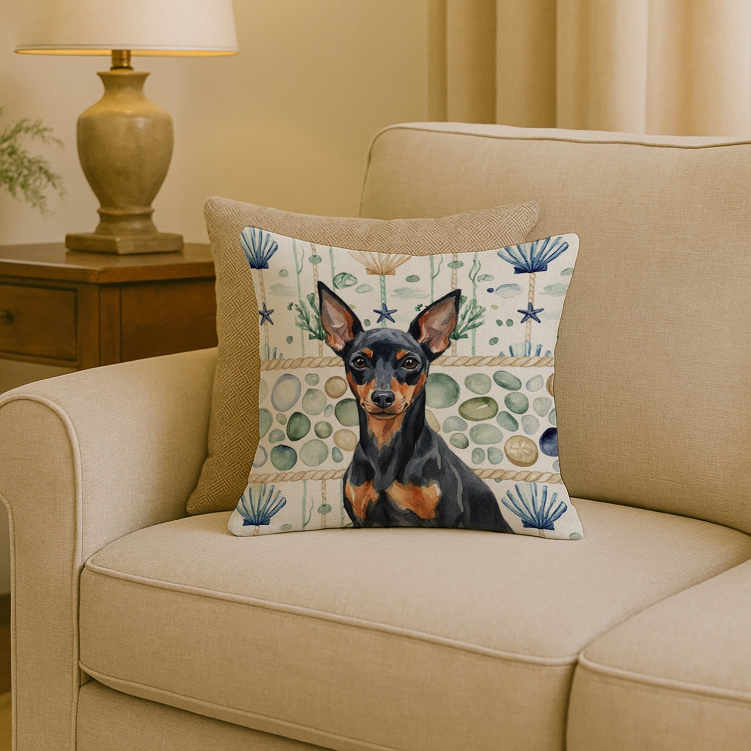 Throw Pillow featuring breed specific Miniature Pinscher artwork. Revitalize your outdoor or indoor living space with Caroline's Treasures 18x18 Fabric Decorative Pillow. With a generously sized dimension of approximately 18 inches by 18 inches, this pillow makes a comfortable and aesthetic addition to any seating area. Made from a unique, water-resistant material developed by Caroline's Treasures, the pillow sham is 100% polyester fabric that's durable and ready to weather any condition. Its vibrant, full-color artwork will not fade over time as it is dyed with color-fast dyes. Whether you place it on your patio furniture, porch, veranda, or indoor couch, its soft canvas fabric ensures a cozy experience. The pillow is handcrafted in the United States, featuring a sham created from three pieces of fabric and a polyester insert for enduring shape and overstuffed comfort. Despite being robustly built to endure the outdoors, it is as soft and snug as your favorite indoor cushions. Please note, as all our pillows are handmade, sizes may vary slightly, adding to the charm of this unique decorative item.