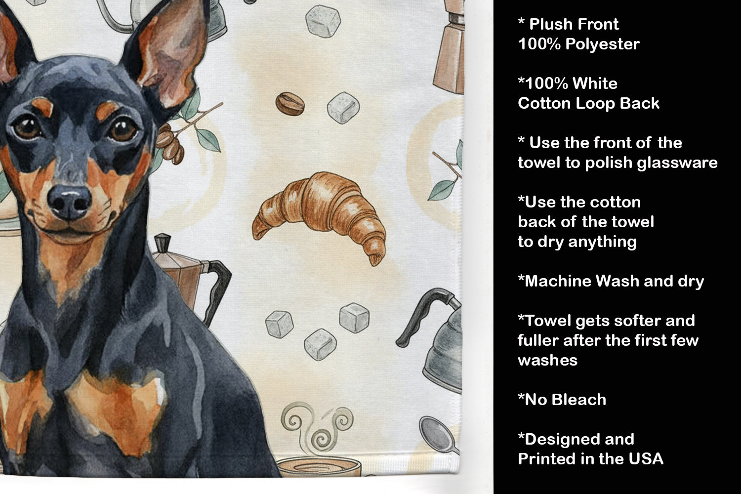 Kitchen Towel featuring breed specific Miniature Pinscher artwork. Start your morning with charm and function thanks to our Coffee Time Kitchen Towel Collection. Featuring playful watercolor artwork of coffee pots, cups, croissants, and a dog portrait, these towels bring warmth and personality to your kitchen or bath. Crafted with a plush minky polyester front that polishes glassware to a shine, and a 100% cotton terry loop back for absorbency, they combine durability with practicality. Artwork is permanently dyed into the fibers to keep colors fresh wash after wash. Measuring 15" x 25", these machine-washable towels are finished with bound edges to hold their shape. Designed and printed in the USA, they’re perfect for kitchens, coffee bars, guest baths, or as thoughtful gifts for dog lovers and coffee enthusiasts alike.