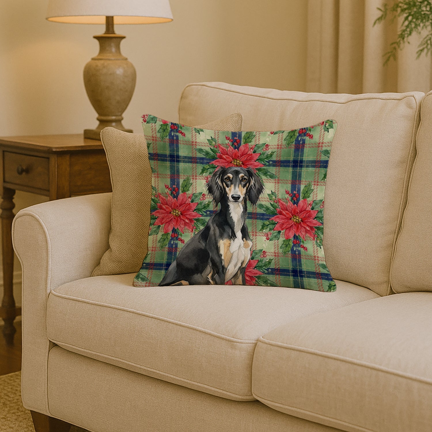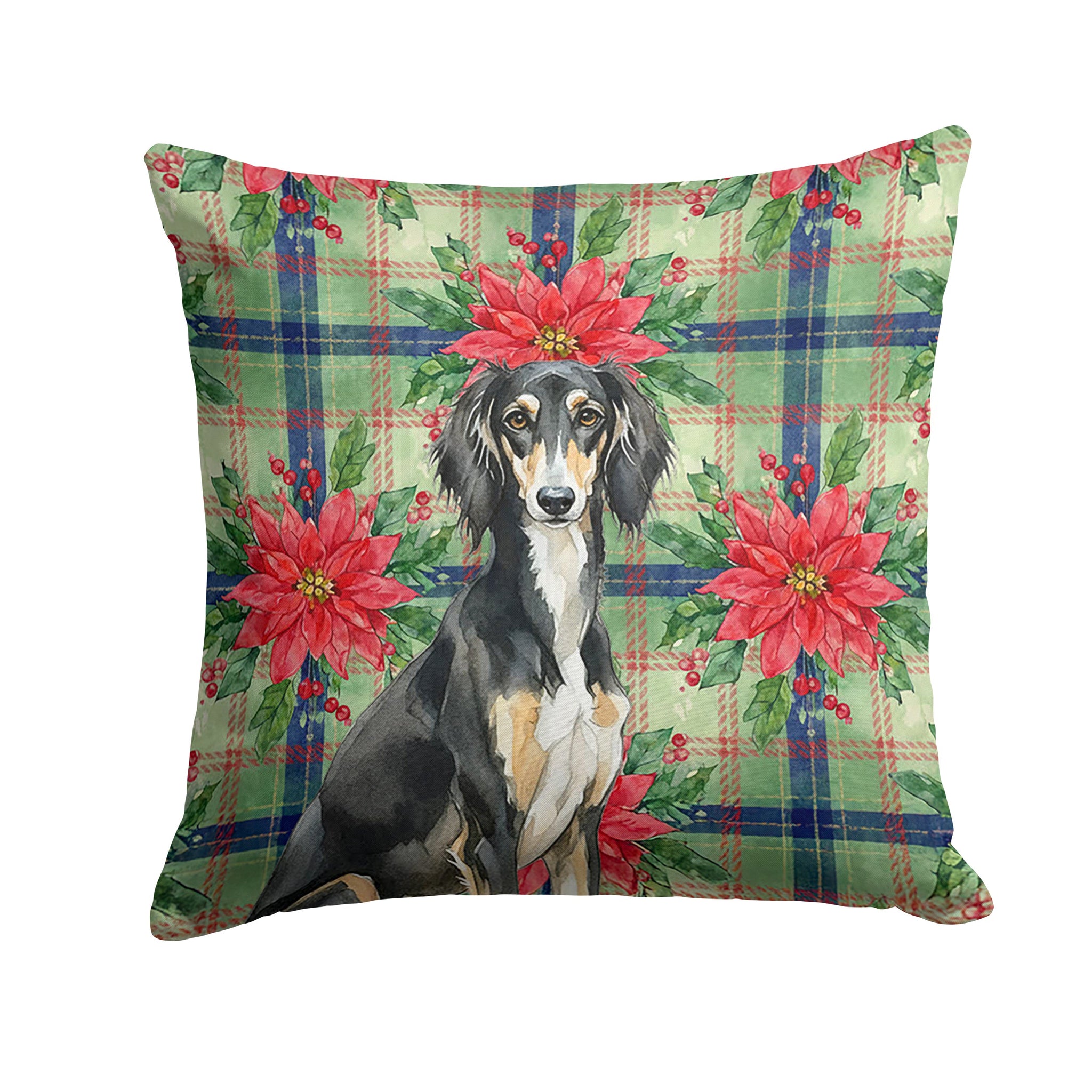 Throw Pillow featuring breed specific Saluki artwork. Celebrate Christmas with this Christmas Pillow. Add a touch of vibrancy and comfort to your outdoor seating with Caroline's Treasures Fabric Decorative Pillow. Measuring approximately 14 inches by 14 inches, this outdoor pillow is crafted to elevate the appeal of your patio furniture, infusing it with vivid color and artistic flair. The pillow includes a 100% Polyester Fabric sham filled with a quality pillow form to provide superior comfort. Innovatively made from our brand new material, specifically woven for its water resistance, this pillow is designed for durability. The soft canvas fabric offers versatility in use, fit for your indoor couch or your outdoor patio, porch, or veranda. The fabric is dyed with colorfast dyes built for resilience against weather conditions, ensuring the pillow retains its beauty over time. Constructed by sewing three fabric pieces to create a sham, the polyester insert is then nestled inside to form the pillow, resulting in an overstuffed pillow that maintains its shape. Both the sham and the pillow insert are proudly made in the United States. As the pillows are handcrafted, there may be minor variations in size, further enhancing their unique charm. Experience comfort in style with Caroline's Treasures Fabric Decorative Pillow.