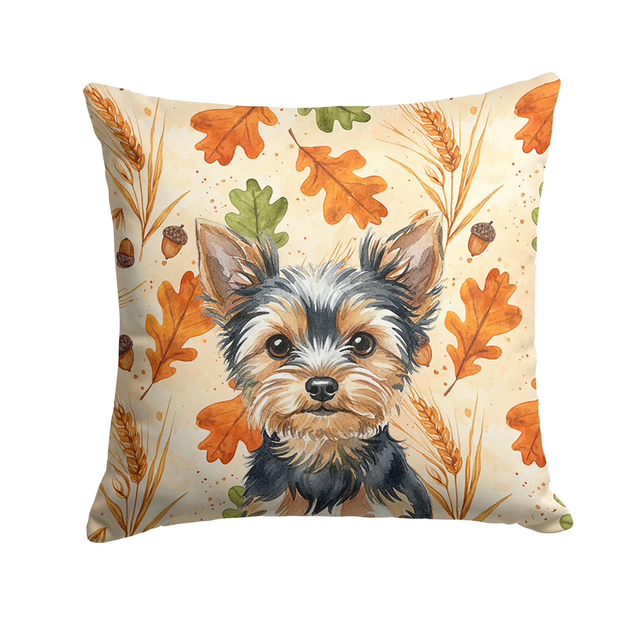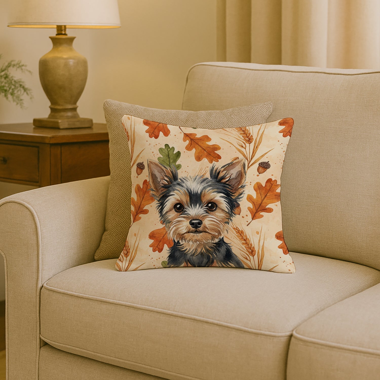 Throw Pillow featuring breed specific Yorkshire Terrier artwork. Celebrate Thanksgiving with this Thanksgiving Pillow. Revitalize your outdoor or indoor living space with Caroline's Treasures 18x18 Fabric Decorative Pillow. With a generously sized dimension of approximately 18 inches by 18 inches, this pillow makes a comfortable and aesthetic addition to any seating area. Made from a unique, water-resistant material developed by Caroline's Treasures, the pillow sham is 100% polyester fabric that's durable and ready to weather any condition. Its vibrant, full-color artwork will not fade over time as it is dyed with color-fast dyes. Whether you place it on your patio furniture, porch, veranda, or indoor couch, its soft canvas fabric ensures a cozy experience. The pillow is handcrafted in the United States, featuring a sham created from three pieces of fabric and a polyester insert for enduring shape and overstuffed comfort. Despite being robustly built to endure the outdoors, it is as soft and snug as your favorite indoor cushions. Please note, as all our pillows are handmade, sizes may vary slightly, adding to the charm of this unique decorative item.