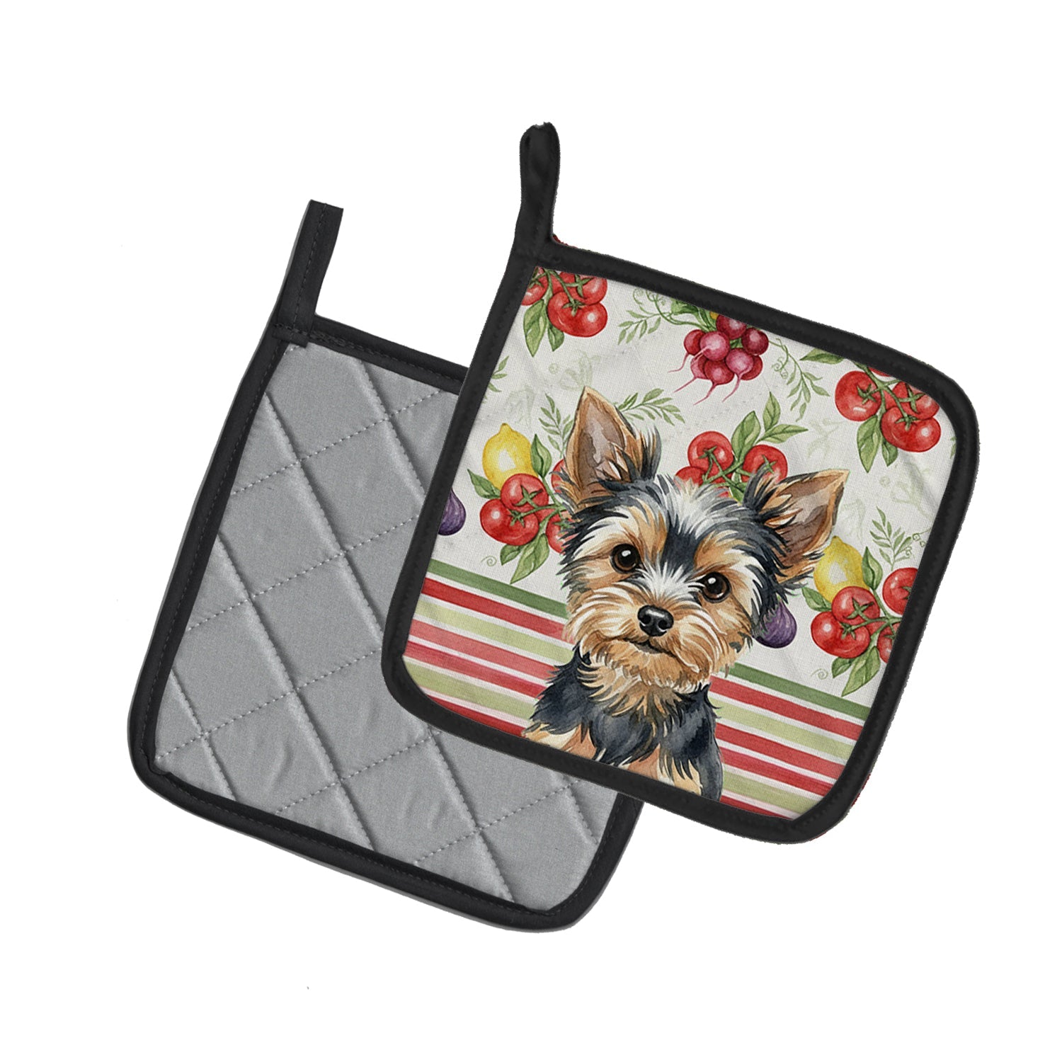 Pair of Pot Holders featuring breed specific Yorkshire Terrier artwork. Add warmth, personality, and function to your kitchen with our Vegetables Pot Holder Pair. Each set includes two quilted hot pads, featuring original full-color watercolor artwork on a soft polyester front accented by black trim. Crafted with multiple layers for performance: Top Layer: Vibrant artwork permanently dyed into polyester fabric. Middle Layer: US-manufactured insulated material with breathable polyester fibers and a reflective metalized film that reflects heat back to its source. Bottom Layer: A silver heat-resistant backing for extra protection. Each pot holder measures 7.5" x 7.5", includes a hanging tab, and is quilted for durability. Use them to protect your hands, countertops, and tabletops — or as decorative trivets for Thanksgiving, Christmas, or everyday meals.