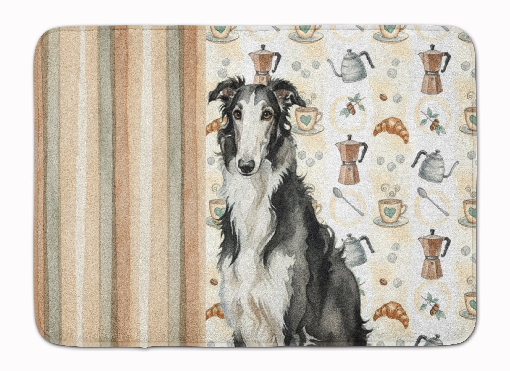 Shown here is the Black and White Borzoi Coffee Bar Memory Foam Kitchen Mat from Caroline's Treasures featuring artwork of a Borzoi in a Everyday design. The detailed illustration and vibrant colors make it a standout accent that celebrates both seasonal style and love for the subject. This image features a cozy watercolor coffee-themed pattern with illustrated mugs, moka pots, kettles, croissants, coffee beans, and sugar cubes arranged in a repeating design. Soft neutral tones with warm browns, creams, and subtle sage accents create an inviting, café-inspired look that feels comforting and relaxed. Everyday décor celebrates personal style and the small moments that make a house feel like home. Thoughtful designs add warmth and personality that can be enjoyed year-round. Transform your floor into a work of art with Caroline's Treasures' Memory Foam Mat. This mat offers not only a stunning visual appeal but also a luxurious, plush feel that's incredibly comfortable to the touch. It's a versatile, machine-washable mat designed for both bath and kitchen use, ensuring you experience the best in comfort and convenience. Care Instructions: Maintaining this memory foam mat is a breeze. Simply follow the care instructions on the product tag. It's recommended to wash in cold water and dry on a low-temperature setting in the dryer. This ensures the mat retains its quality and longevity, allowing you to enjoy its beauty and comfort for a long time. Caroline's Treasures' Memory Foam Mat Machine Washable is the perfect blend of artistry, comfort, and practicality, making it a standout addition to any space. Upgrade your home decor with this versatile and stylish mat today. Borzoi dogs are tall and slender with flowing coats. Their elegant form reflects grace and speed. Makes a heartfelt gift for: Borzoi owners, Dogs lovers, Everyday gifts, pet parents, friends who adore their Borzoi, or anyone celebrating Dogs.