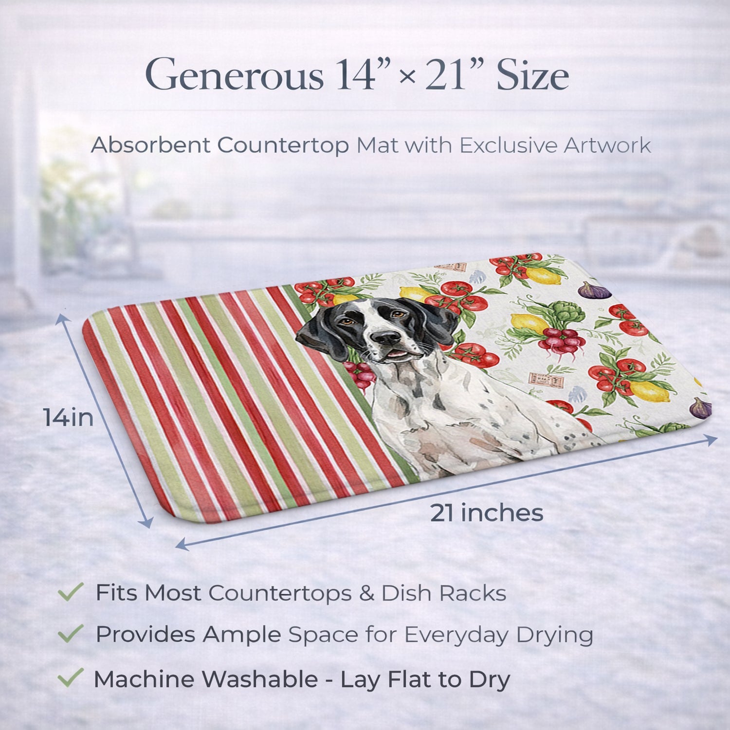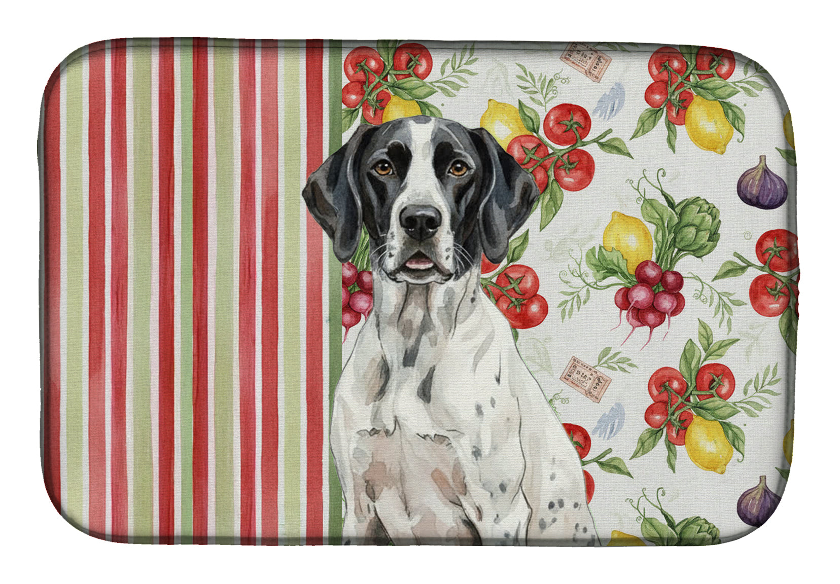 Shown here is the Black and White Pointer Vegetables Dish Drying Mat from Caroline's Treasures featuring artwork of a Pointer in a Everyday design. The detailed illustration and vibrant colors make it a standout accent that celebrates both seasonal style and love for the subject. This image features a vibrant watercolor vegetable pattern with tomatoes, lemons, artichokes, figs, radishes, and leafy greens arranged in a repeating design, paired with classic red and green stripes. The bright, garden-fresh palette creates a cheerful, farmhouse-inspired look that feels lively, welcoming, and perfect for kitchen décor. Everyday décor celebrates personal style and the small moments that make a house feel like home. Thoughtful designs add warmth and personality that can be enjoyed year-round. Say goodbye to messy countertops and soggy dish towels with our innovative dish drying mat. Our high-quality dish drying pad is designed to keep your countertops dry while offering a stylish and efficient solution. Whether you're air drying dishes, glasses, stemware, silverware, pots, pans, bottles, or even fruits and vegetables, our dish mat is the perfect choice. The 14 inches x 21 inches size fits most counters and dish drying racks, and the non-slip design ensures stability. Made with water-absorbent polyester and a polyurethane foam insert, our dish drying mat is not only functional but also durable. It's machine washable and printed in the USA for long-lasting use. The beautiful artwork adds flair to your kitchen decor, making it a perfect housewarming gift or present for any occasion. Upgrade your kitchen experience with our absorbent and versatile dish drying mat. Perfect for: Kitchen counters and sinks, everyday dish drying and countertop protection, Dogs-themed homes, or year-round use for Pointer lovers. Pointers are athletic sporting dogs known for their focus and endurance. This hunting breed is admired for its intelligence, loyalty, and strong work drive. Makes a heartfelt gift for: Pointer owners, Dogs lovers, Everyday gifts, pet parents, friends who adore their Pointer, or anyone celebrating Dogs.
