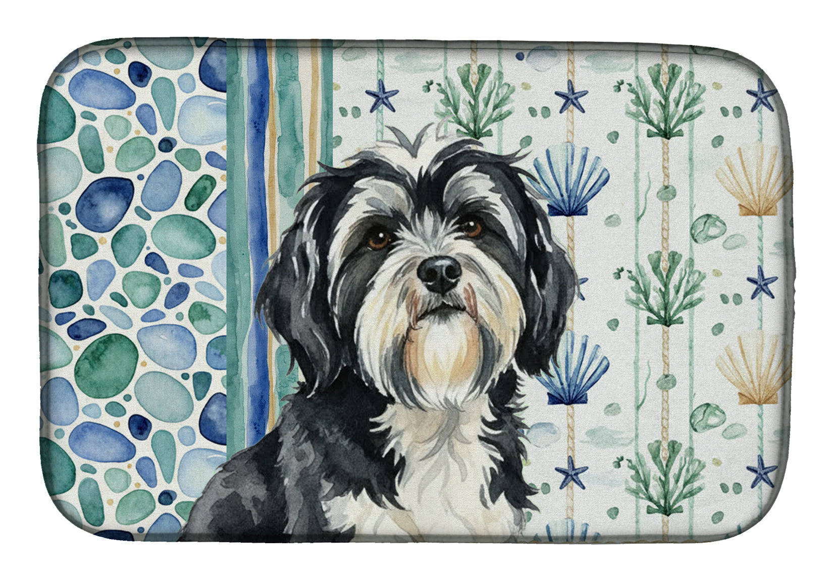 Shown here is the Black and White Tibetan Terrier Coastal Sea Glass Dish Drying Mat from Caroline's Treasures featuring artwork of a Tibetan Terrier in a Everyday design. The detailed illustration and vibrant colors make it a standout accent that celebrates both seasonal style and love for the subject. This image features a calming coastal watercolor pattern with soft seashells, seaweed, starfish, and pebble-inspired accents arranged in a repeating design. The soothing palette of blues, greens, and sandy neutrals creates a relaxed, beach-inspired look that adds a fresh and tranquil feel to any space. Everyday décor celebrates personal style and the small moments that make a house feel like home. Thoughtful designs add warmth and personality that can be enjoyed year-round. Say goodbye to messy countertops and soggy dish towels with our innovative dish drying mat. Our high-quality dish drying pad is designed to keep your countertops dry while offering a stylish and efficient solution. Whether you're air drying dishes, glasses, stemware, silverware, pots, pans, bottles, or even fruits and vegetables, our dish mat is the perfect choice. The 14 inches x 21 inches size fits most counters and dish drying racks, and the non-slip design ensures stability. Made with water-absorbent polyester and a polyurethane foam insert, our dish drying mat is not only functional but also durable. It's machine washable and printed in the USA for long-lasting use. The beautiful artwork adds flair to your kitchen decor, making it a perfect housewarming gift or present for any occasion. Upgrade your kitchen experience with our absorbent and versatile dish drying mat. Perfect for: Kitchen counters and sinks, everyday dish drying and countertop protection, Dogs-themed homes, or year-round use for Tibetan Terrier lovers. Tibetan Terriers are sturdy dogs known for their friendly disposition and intelligence. Despite the name, this breed is valued for its loyalty and adaptability. Makes a heartfelt gift for: Tibetan Terrier owners, Dogs lovers, Everyday gifts, pet parents, friends who adore their Tibetan Terrier, or anyone celebrating Dogs.