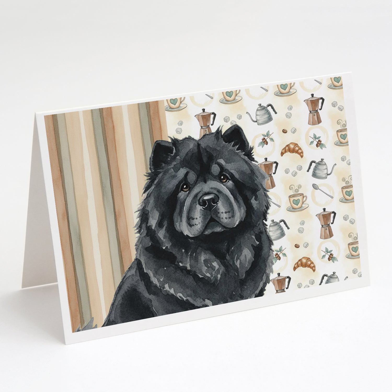 Shown here is the Black Chow Chow Coffee Bar Greeting Cards Pack of 8 from Caroline's Treasures featuring artwork of a Chow Chow in a Everyday design. The detailed illustration and vibrant colors make it a standout accent that celebrates both seasonal style and love for the subject. This image features a cozy watercolor coffee-themed pattern with illustrated mugs, moka pots, kettles, croissants, coffee beans, and sugar cubes arranged in a repeating design. Soft neutral tones with warm browns, creams, and subtle sage accents create an inviting, café-inspired look that feels comforting and relaxed. Everyday décor celebrates personal style and the small moments that make a house feel like home. Thoughtful designs add warmth and personality that can be enjoyed year-round. Celebrate special moments with Caroline's Treasures Printed Greeting Card Pack. This pack includes eight beautifully folded 5x7 cards, accompanied by eight matching white envelopes. With blank interiors, these cards provide ample space for your personalized messages and heartfelt holiday greetings. Each card features captivating full-color artwork, meticulously printed in our facility on high-quality 80 lb cover stock or 216 GSM. The super smooth finish of the white cards enhances the visual impact of the artwork, creating a truly stunning presentation. Designed by our talented in-house artists or licensed artists, the artwork on these cards showcases their creativity and attention to detail. From vibrant illustrations to captivating designs, each card tells its own unique story. Whether it's for birthdays, anniversaries, holidays, or any special occasion, Caroline's Treasures Greeting Card Pack is the perfect way to convey your heartfelt sentiments. Share joy, love, and warm wishes with these exquisite cards and make every moment unforgettable. Perfect for: Writing personal messages, everyday correspondence, and thoughtful notes, Dogs-themed stationery collections, or year-round use for Chow Chow lovers. Chow Chows are dignified dogs known for their lion-like appearance and reserved temperament. This ancient breed is respected for its independence, loyalty, and calm presence. Makes a heartfelt gift for: Chow Chow owners, Dogs lovers, Everyday gifts, pet parents, friends who adore their Chow Chow, or anyone celebrating Dogs.