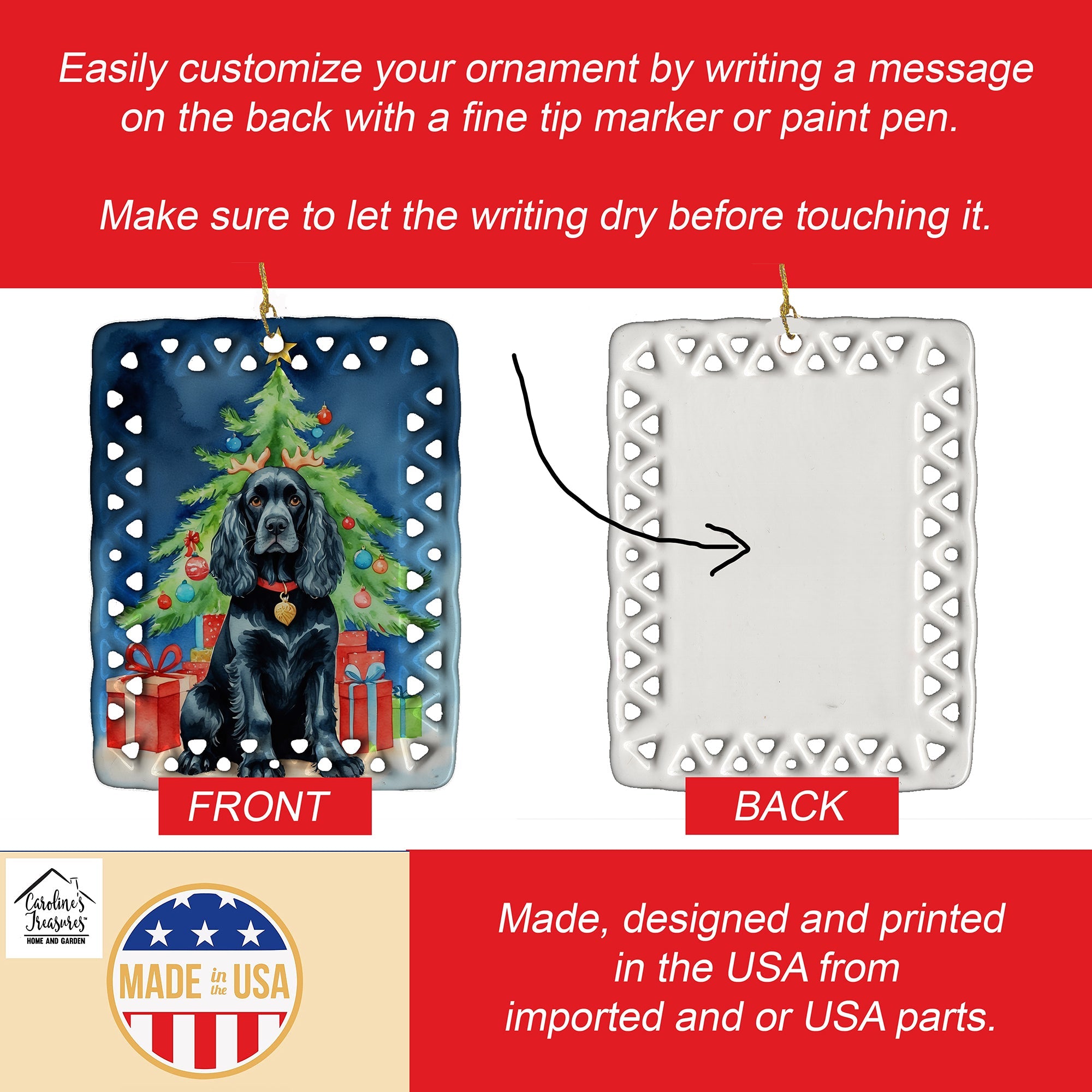 Porcelain Ornament featuring breed specific Cocker Spaniel artwork. Celebrate Christmas with this Christmas Ornament. Add a unique, personal touch to your holiday decor with our Rectangular Lattice Porcelain Ornament. Perfect for creating cherished memories, this high-quality ornament shines under festive lights, reflecting warmth and joy throughout your Christmas tree. Crafted with a glossy finish, it showcases vibrant, full-color artwork contributed by our talented artists, ensuring your tree is adorned with a burst of color and holiday spirit. What sets this Porcelain Ornament apart is its customizable white back. Use a paint pen or permanent marker to write a heartfelt message, commemorate a special year, or mark an unforgettable date, turning this ornament into a keepsake that will be treasured for years to come. For best results, allow any personalization to dry thoroughly before handling. Each ornament comes complete with a delicate gold cord, making it easy to hang and display. Proudly made in the USA, this ornament measures 3.375 x 2.625 inches and is a thoughtful gift for pet sitters, teachers, family members, or anyone who would appreciate a little extra holiday magic. Bring style, charm, and a touch of personal meaning to your Christmas tree with this beautifully designed ornament..