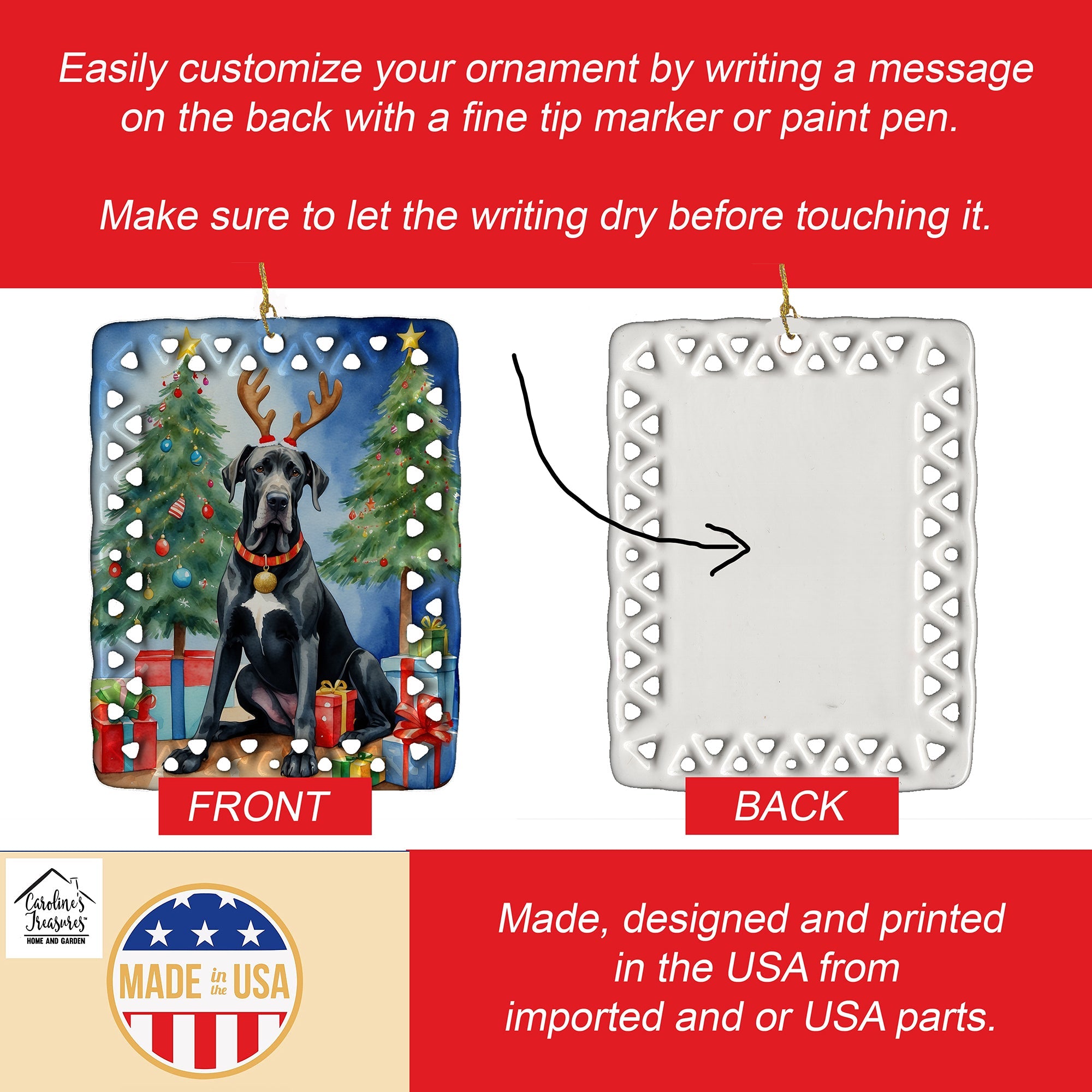 Porcelain Ornament featuring breed specific Great Dane artwork. Celebrate Christmas with this Christmas Ornament. Add a unique, personal touch to your holiday decor with our Rectangular Lattice Porcelain Ornament. Perfect for creating cherished memories, this high-quality ornament shines under festive lights, reflecting warmth and joy throughout your Christmas tree. Crafted with a glossy finish, it showcases vibrant, full-color artwork contributed by our talented artists, ensuring your tree is adorned with a burst of color and holiday spirit. What sets this Porcelain Ornament apart is its customizable white back. Use a paint pen or permanent marker to write a heartfelt message, commemorate a special year, or mark an unforgettable date, turning this ornament into a keepsake that will be treasured for years to come. For best results, allow any personalization to dry thoroughly before handling. Each ornament comes complete with a delicate gold cord, making it easy to hang and display. Proudly made in the USA, this ornament measures 3.375 x 2.625 inches and is a thoughtful gift for pet sitters, teachers, family members, or anyone who would appreciate a little extra holiday magic. Bring style, charm, and a touch of personal meaning to your Christmas tree with this beautifully designed ornament..