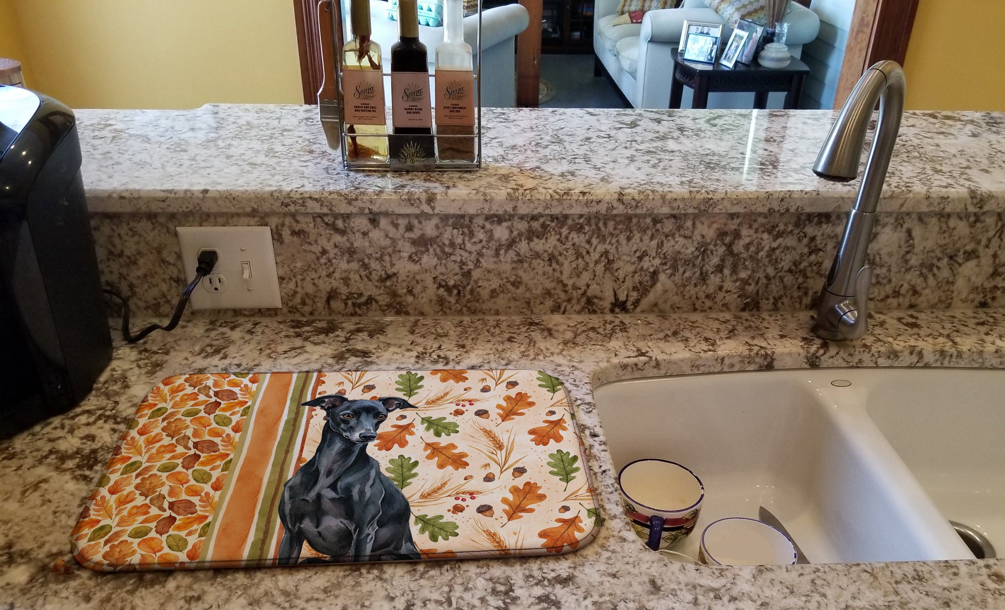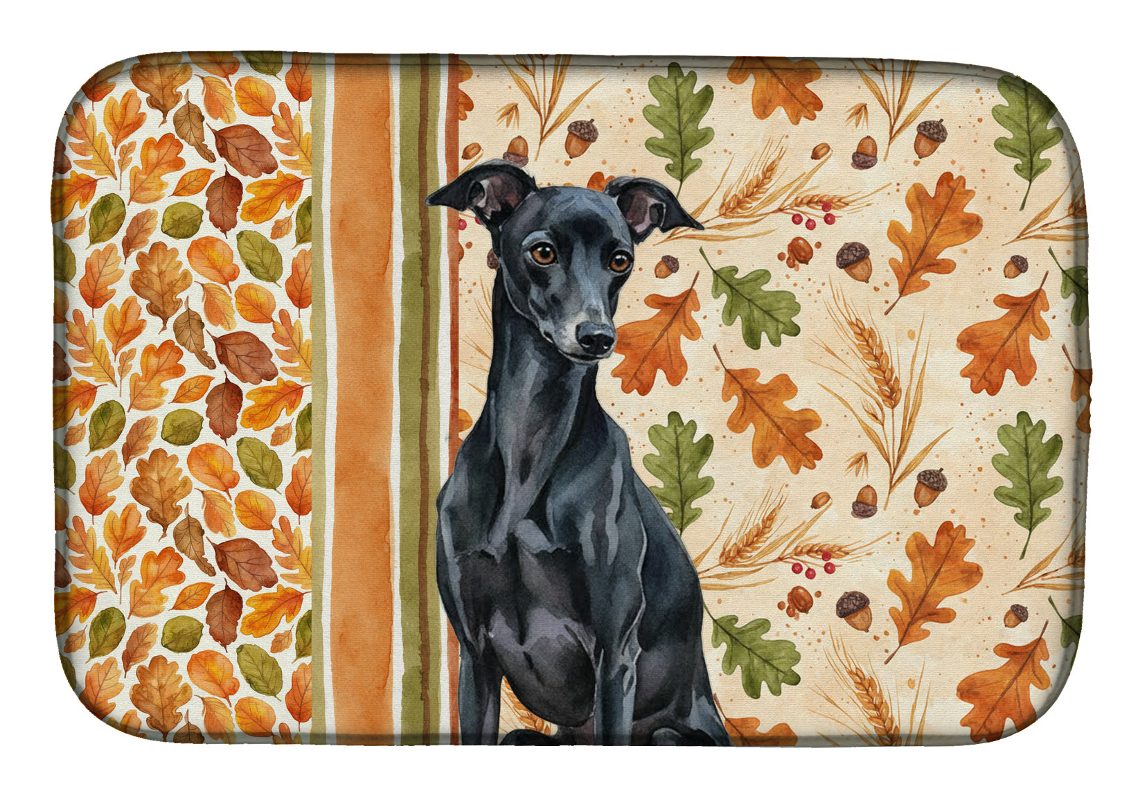 Dish Drying Mat featuring breed specific Italian Greyhound artwork. Celebrate Thanksgiving with this Thanksgiving Dish Drying Mat. Say goodbye to messy countertops and soggy dish towels with our innovative dish drying mat. Our high-quality dish drying pad is designed to keep your countertops dry while offering a stylish and efficient solution. Whether you're air drying dishes, glasses, stemware, silverware, pots, pans, bottles, or even fruits and vegetables, our dish mat is the perfect choice. The 14 inches x 22 inches size fits most counters and dish drying racks, and the non-slip design ensures stability. Made with water-absorbent polyester and a polyurethane foam insert, our dish drying mat is not only functional but also durable. It's machine washable and printed in the USA for long-lasting use. The beautiful artwork adds flair to your kitchen decor, making it a perfect housewarming gift or present for any occasion. Upgrade your kitchen experience with our absorbent and versatile dish drying mat.