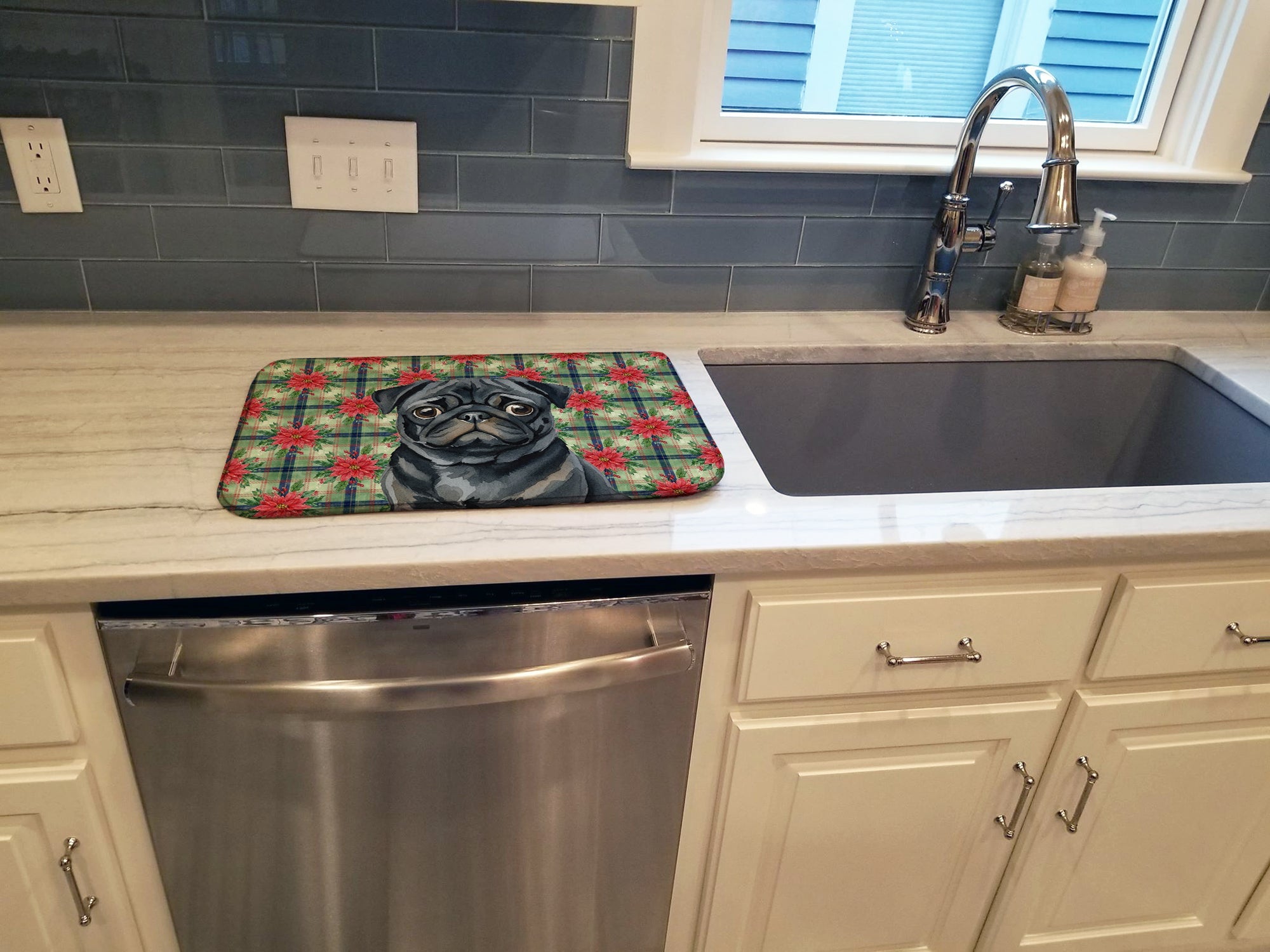 Dish Drying Mat featuring breed specific Pug artwork. Celebrate Christmas with this Christmas Dish Drying Mat. Say goodbye to messy countertops and soggy dish towels with our innovative dish drying mat. Our high-quality dish drying pad is designed to keep your countertops dry while offering a stylish and efficient solution. Whether you're air drying dishes, glasses, stemware, silverware, pots, pans, bottles, or even fruits and vegetables, our dish mat is the perfect choice. The 14 inches x 22 inches size fits most counters and dish drying racks, and the non-slip design ensures stability. Made with water-absorbent polyester and a polyurethane foam insert, our dish drying mat is not only functional but also durable. It's machine washable and printed in the USA for long-lasting use. The beautiful artwork adds flair to your kitchen decor, making it a perfect housewarming gift or present for any occasion. Upgrade your kitchen experience with our absorbent and versatile dish drying mat.