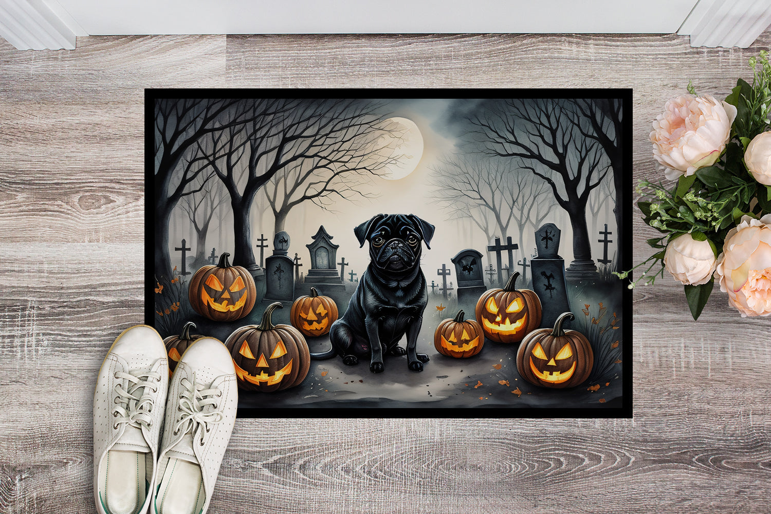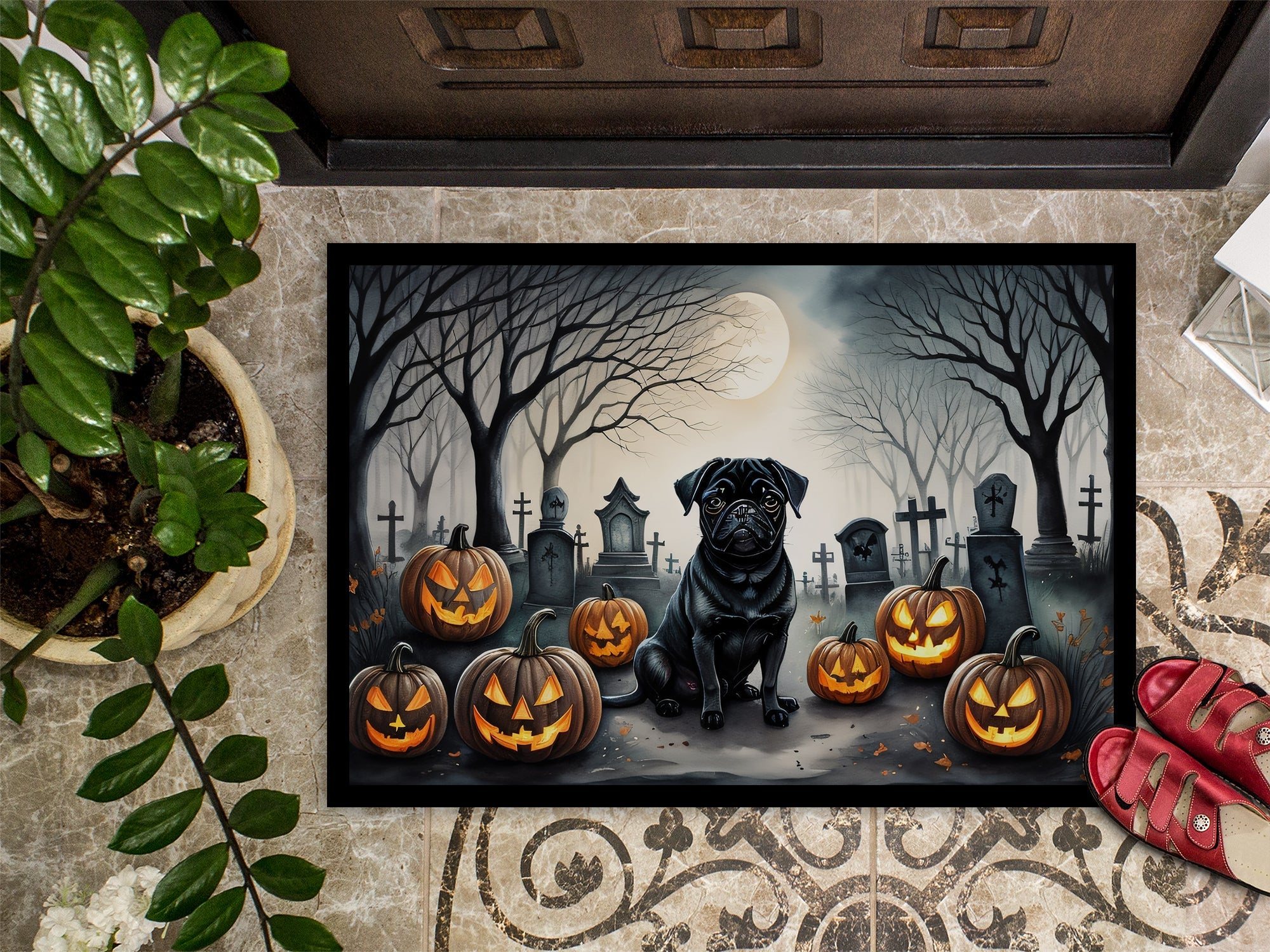 Decorate your space with our Halloween Pug artwork on a Doormat. Welcome your guests in style with our Artwork Door Mat, designed to withstand almost any weather condition. This mat, measuring approximately 24 by 36 inches, is held together by durable black binding tape. Its top layer, composed of polyester felt, is dyed with the eye-catching image you see on the mat. A few layers below provide the mat with stability, while its rubber bottom is stamped to help prevent slipping and ensures safety. Our mat works wonderfully as both an indoor or outdoor door mat. For cleaning, simply hose it off with water or use a power washer - no need for any cleaner that produces suds. Avoid scrubbing with a brush, instead, opt for the vacuum on floor setting. Designed manufactured and printed in the USA, this mat is a perfect addition to your porch, outdoor kitchen, entryway, or any indoor space. Its unique design makes it a charming decorative rug that greets your guests and adds a stylish touch to your home decor.