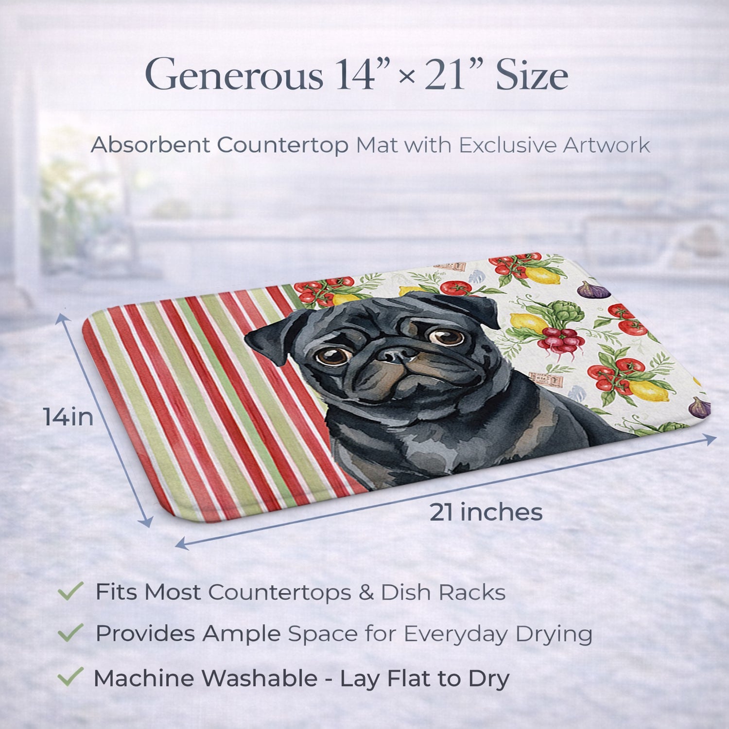 Shown here is the Black Pug Vegetables Dish Drying Mat from Caroline's Treasures featuring artwork of a Pug in a Everyday design. The detailed illustration and vibrant colors make it a standout accent that celebrates both seasonal style and love for the subject. This image features a vibrant watercolor vegetable pattern with tomatoes, lemons, artichokes, figs, radishes, and leafy greens arranged in a repeating design, paired with classic red and green stripes. The bright, garden-fresh palette creates a cheerful, farmhouse-inspired look that feels lively, welcoming, and perfect for kitchen décor. Everyday décor celebrates personal style and the small moments that make a house feel like home. Thoughtful designs add warmth and personality that can be enjoyed year-round. Say goodbye to messy countertops and soggy dish towels with our innovative dish drying mat. Our high-quality dish drying pad is designed to keep your countertops dry while offering a stylish and efficient solution. Whether you're air drying dishes, glasses, stemware, silverware, pots, pans, bottles, or even fruits and vegetables, our dish mat is the perfect choice. The 14 inches x 21 inches size fits most counters and dish drying racks, and the non-slip design ensures stability. Made with water-absorbent polyester and a polyurethane foam insert, our dish drying mat is not only functional but also durable. It's machine washable and printed in the USA for long-lasting use. The beautiful artwork adds flair to your kitchen decor, making it a perfect housewarming gift or present for any occasion. Upgrade your kitchen experience with our absorbent and versatile dish drying mat. Perfect for: Kitchen counters and sinks, everyday dish drying and countertop protection, Dogs-themed homes, or year-round use for Pug lovers. Pugs are charming companion dogs known for their expressive faces and affectionate personality. This breed is loved for its loyalty, playful nature, and strong bond with family. Makes a heartfelt gift for: Pug owners, Dogs lovers, Everyday gifts, pet parents, friends who adore their Pug, or anyone celebrating Dogs.