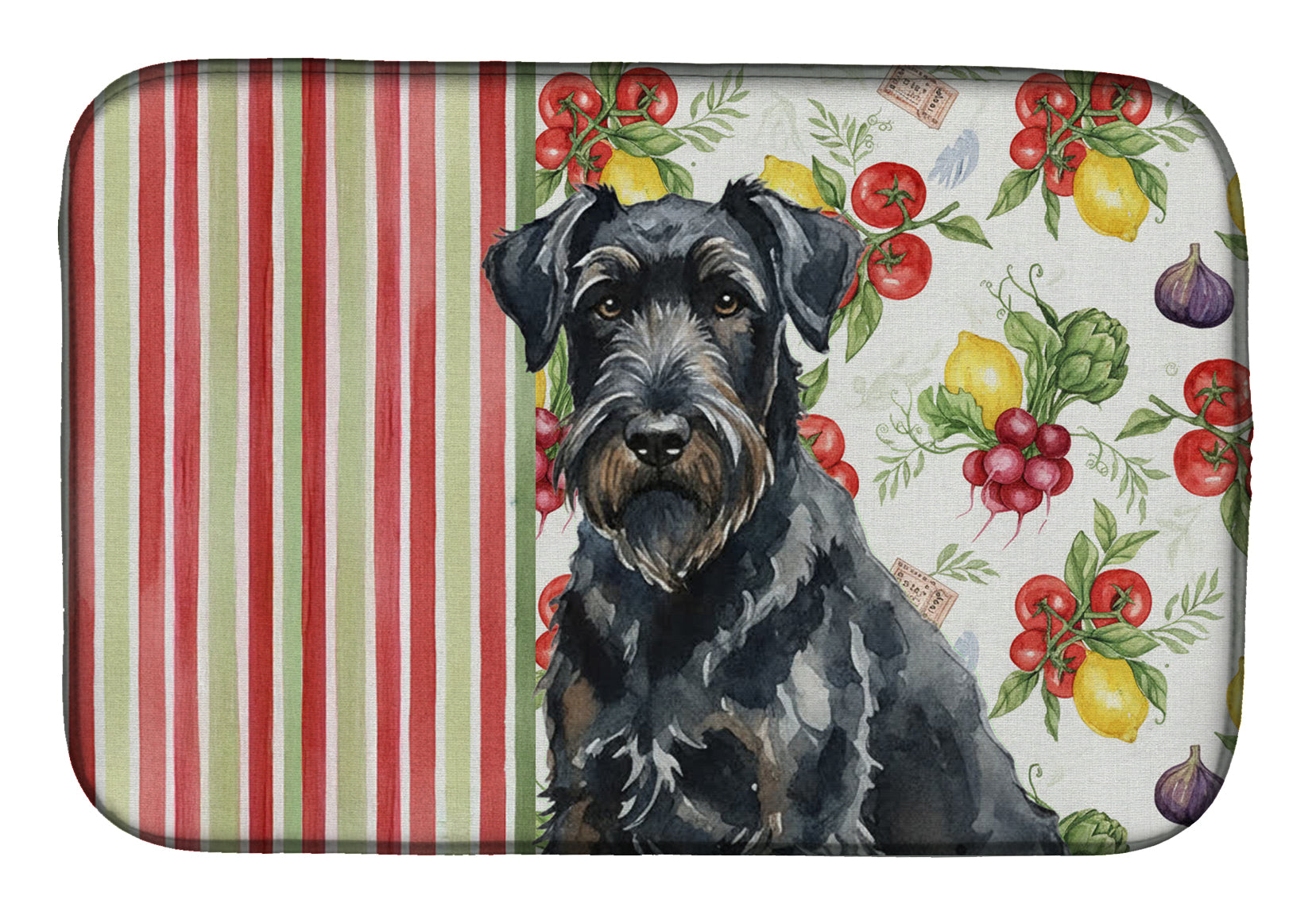 Shown here is the Black Russian Terrier Vegetables Dish Drying Mat from Caroline's Treasures featuring artwork of a Black Russian Terrier in a Everyday design. The detailed illustration and vibrant colors make it a standout accent that celebrates both seasonal style and love for the subject. This image features a vibrant watercolor vegetable pattern with tomatoes, lemons, artichokes, figs, radishes, and leafy greens arranged in a repeating design, paired with classic red and green stripes. The bright, garden-fresh palette creates a cheerful, farmhouse-inspired look that feels lively, welcoming, and perfect for kitchen décor. Everyday décor celebrates personal style and the small moments that make a house feel like home. Thoughtful designs add warmth and personality that can be enjoyed year-round. Say goodbye to messy countertops and soggy dish towels with our innovative dish drying mat. Our high-quality dish drying pad is designed to keep your countertops dry while offering a stylish and efficient solution. Whether you're air drying dishes, glasses, stemware, silverware, pots, pans, bottles, or even fruits and vegetables, our dish mat is the perfect choice. The 14 inches x 21 inches size fits most counters and dish drying racks, and the non-slip design ensures stability. Made with water-absorbent polyester and a polyurethane foam insert, our dish drying mat is not only functional but also durable. It's machine washable and printed in the USA for long-lasting use. The beautiful artwork adds flair to your kitchen decor, making it a perfect housewarming gift or present for any occasion. Upgrade your kitchen experience with our absorbent and versatile dish drying mat. Perfect for: Kitchen counters and sinks, everyday dish drying and countertop protection, Dogs-themed homes, or year-round use for Black Russian Terrier lovers. Black Russian Terriers are powerful working dogs known for their confidence and protective instincts. This intelligent breed is respected for its loyalty and calm, steady temperament. Makes a heartfelt gift for: Black Russian Terrier owners, Dogs lovers, Everyday gifts, pet parents, friends who adore their Black Russian Terrier, or anyone celebrating Dogs.