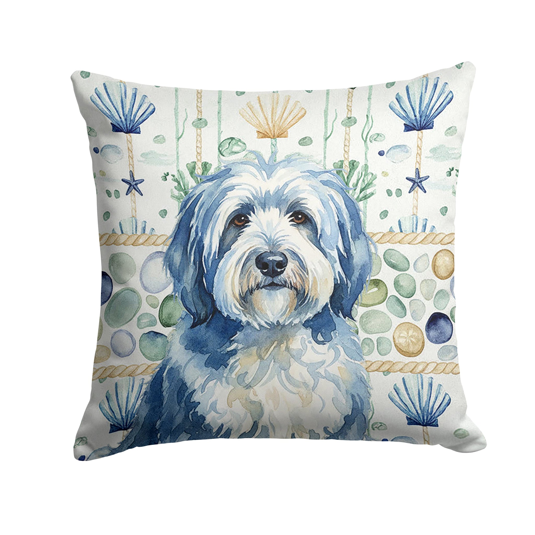 Throw Pillow featuring breed specific Old English Sheepdog artwork. Revitalize your outdoor or indoor living space with Caroline's Treasures 18x18 Fabric Decorative Pillow. With a generously sized dimension of approximately 18 inches by 18 inches, this pillow makes a comfortable and aesthetic addition to any seating area. Made from a unique, water-resistant material developed by Caroline's Treasures, the pillow sham is 100% polyester fabric that's durable and ready to weather any condition. Its vibrant, full-color artwork will not fade over time as it is dyed with color-fast dyes. Whether you place it on your patio furniture, porch, veranda, or indoor couch, its soft canvas fabric ensures a cozy experience. The pillow is handcrafted in the United States, featuring a sham created from three pieces of fabric and a polyester insert for enduring shape and overstuffed comfort. Despite being robustly built to endure the outdoors, it is as soft and snug as your favorite indoor cushions. Please note, as all our pillows are handmade, sizes may vary slightly, adding to the charm of this unique decorative item.
