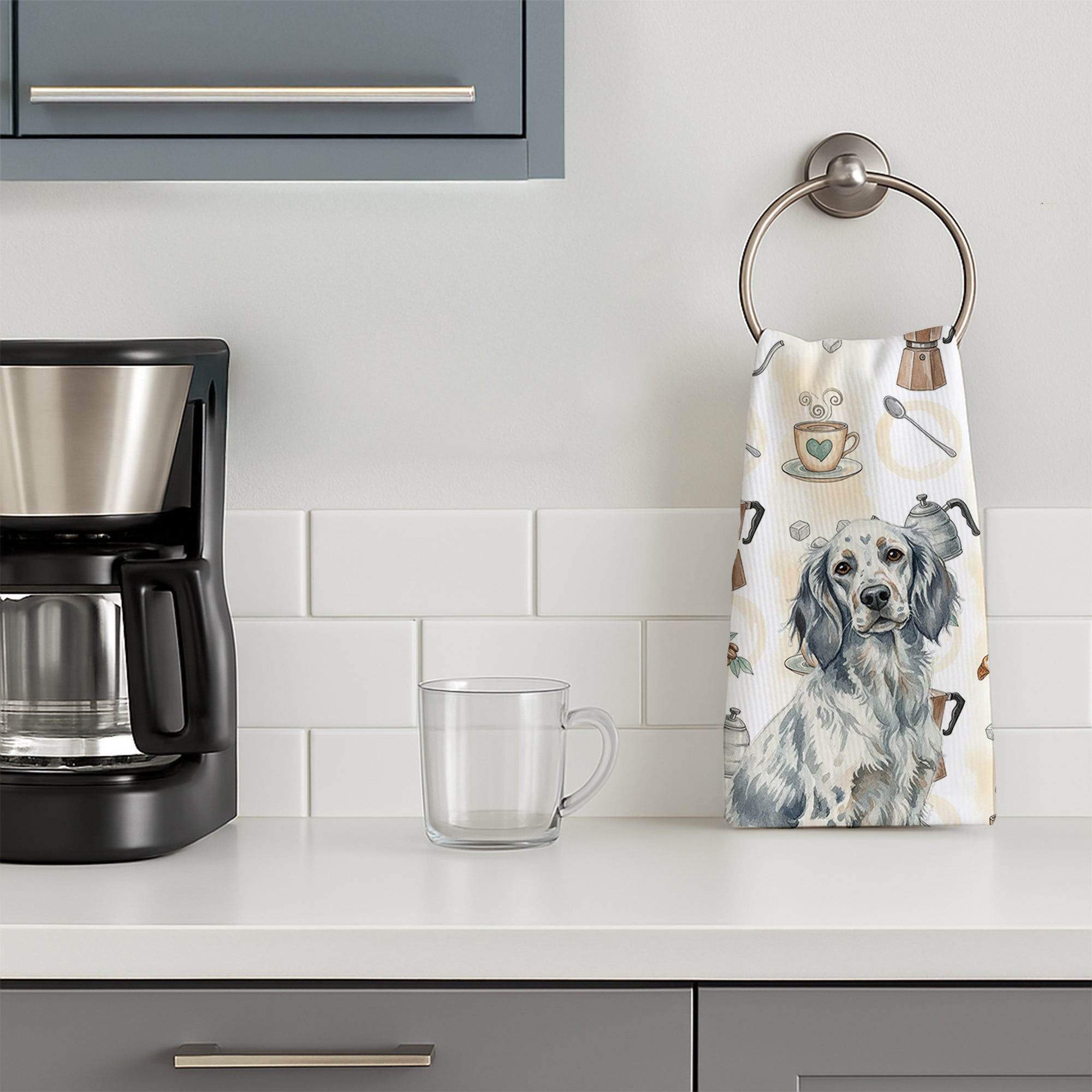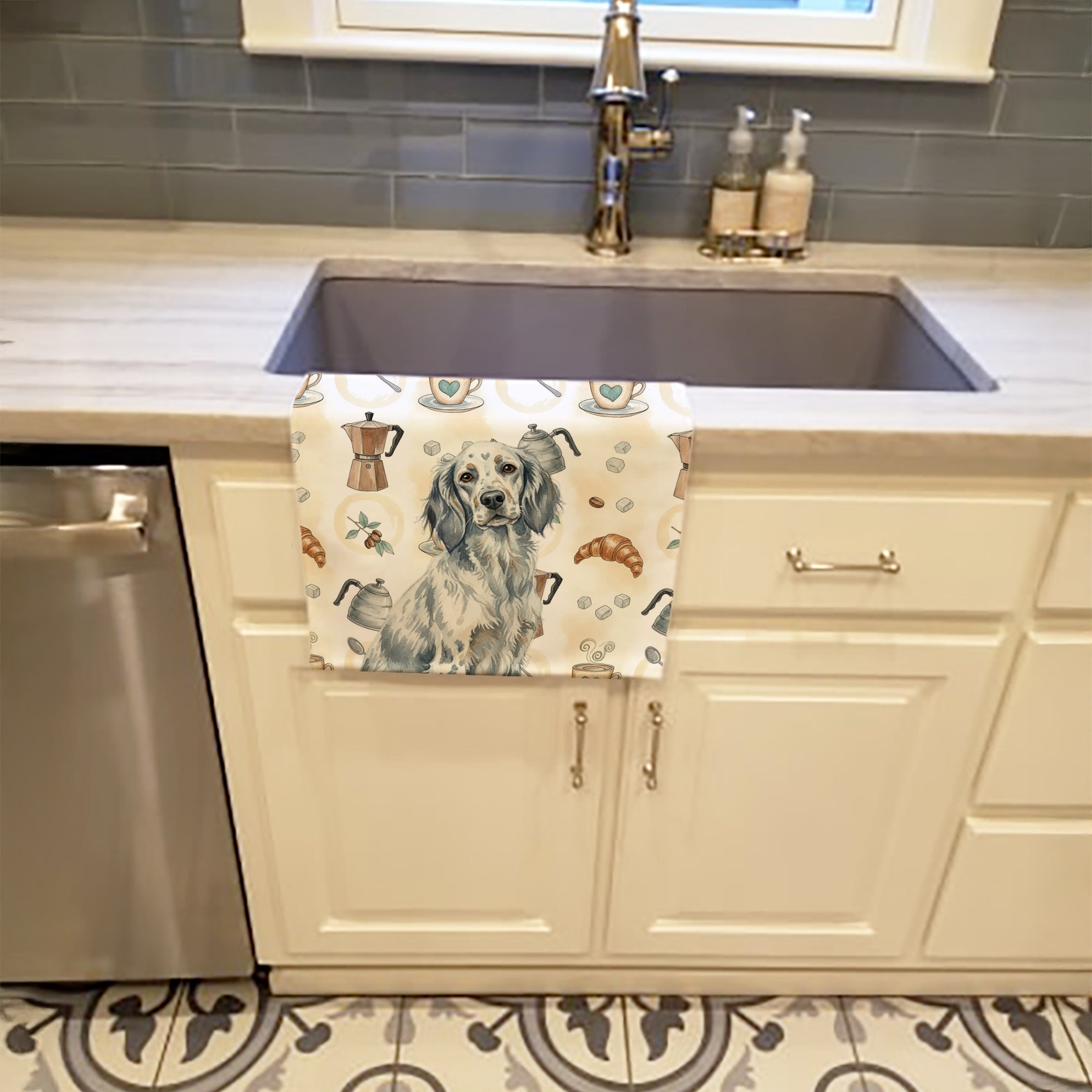 Kitchen Towel featuring breed specific English Setter artwork. Start your morning with charm and function thanks to our Coffee Time Kitchen Towel Collection. Featuring playful watercolor artwork of coffee pots, cups, croissants, and a dog portrait, these towels bring warmth and personality to your kitchen or bath. Crafted with a plush minky polyester front that polishes glassware to a shine, and a 100% cotton terry loop back for absorbency, they combine durability with practicality. Artwork is permanently dyed into the fibers to keep colors fresh wash after wash. Measuring 15" x 25", these machine-washable towels are finished with bound edges to hold their shape. Designed and printed in the USA, they’re perfect for kitchens, coffee bars, guest baths, or as thoughtful gifts for dog lovers and coffee enthusiasts alike.