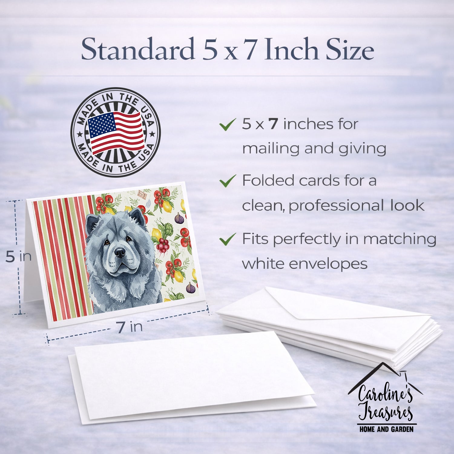 Shown here is the Blue Chow Chow Vegetables Greeting Cards Pack of 8 from Caroline's Treasures featuring artwork of a Chow Chow in a Everyday design. The detailed illustration and vibrant colors make it a standout accent that celebrates both seasonal style and love for the subject. This image features a vibrant watercolor vegetable pattern with tomatoes, lemons, artichokes, figs, radishes, and leafy greens arranged in a repeating design, paired with classic red and green stripes. The bright, garden-fresh palette creates a cheerful, farmhouse-inspired look that feels lively, welcoming, and perfect for kitchen décor. Everyday décor celebrates personal style and the small moments that make a house feel like home. Thoughtful designs add warmth and personality that can be enjoyed year-round. Celebrate special moments with Caroline's Treasures Printed Greeting Card Pack. This pack includes eight beautifully folded 5x7 cards, accompanied by eight matching white envelopes. With blank interiors, these cards provide ample space for your personalized messages and heartfelt holiday greetings. Each card features captivating full-color artwork, meticulously printed in our facility on high-quality 80 lb cover stock or 216 GSM. The super smooth finish of the white cards enhances the visual impact of the artwork, creating a truly stunning presentation. Designed by our talented in-house artists or licensed artists, the artwork on these cards showcases their creativity and attention to detail. From vibrant illustrations to captivating designs, each card tells its own unique story. Whether it's for birthdays, anniversaries, holidays, or any special occasion, Caroline's Treasures Greeting Card Pack is the perfect way to convey your heartfelt sentiments. Share joy, love, and warm wishes with these exquisite cards and make every moment unforgettable. Perfect for: Writing personal messages, everyday correspondence, and thoughtful notes, Dogs-themed stationery collections, or year-round use for Chow Chow lovers. Chow Chows are dignified dogs known for their lion-like appearance and reserved temperament. This ancient breed is respected for its independence, loyalty, and calm presence. Makes a heartfelt gift for: Chow Chow owners, Dogs lovers, Everyday gifts, pet parents, friends who adore their Chow Chow, or anyone celebrating Dogs.